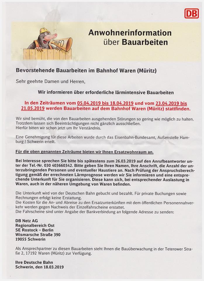 Viele Warener, die in der Nähe des Bahnhofs wohnen, leiden schon seit längerem unter dem Baulärm, der durch die aktuellen Arbeiten an den Gleisen in der Müritzstadt entsteht. Doch es wird offenbar noch viel schlimmer. Die Bahn hat jetzt Anwohner sozusagen gewarnt und ihnen sogar Ersatzwohnungen angeboten, denn ab dem 5. April soll’s richtig laut werden.Betroffene können sich bei der Bahn melden und erhalten nach Prüfung für die lärmintesive Zeit eine Ersatzwohnung.