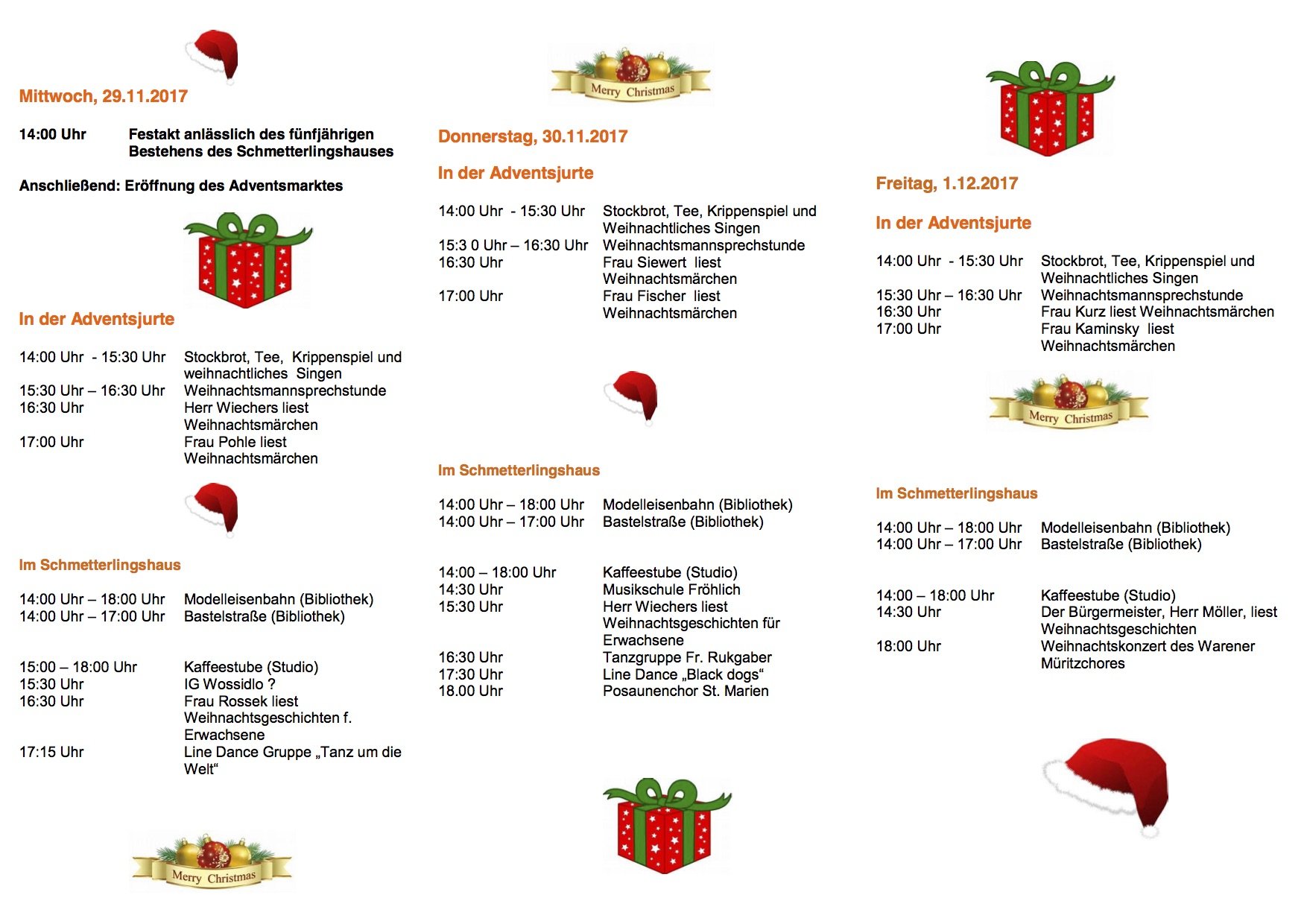 Auch am Donnerstag und Freitag ist der Weihnachtsmarkt und im Schmetterlingshaus noch geöffnet. Das komplette Programm gibt es unten im Fotos.