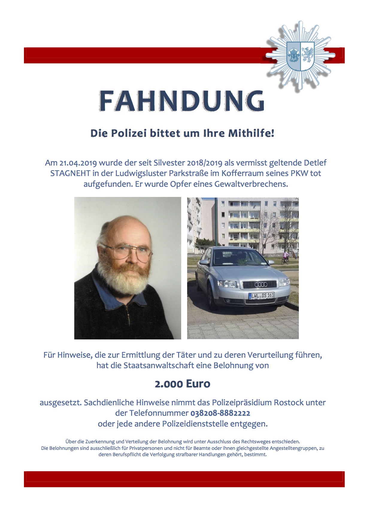 Am 21.04.2019 wurde der seit Silvester 2018/2019 als vermisst geltende Detlef Stagneth in der Parkstraße in Ludwigslust im Kofferraum seines Pkw tot aufgefunden. Die Sektion des Toten hat ergeben, dass er Opfer eines Gewaltverbrechens geworden ist.