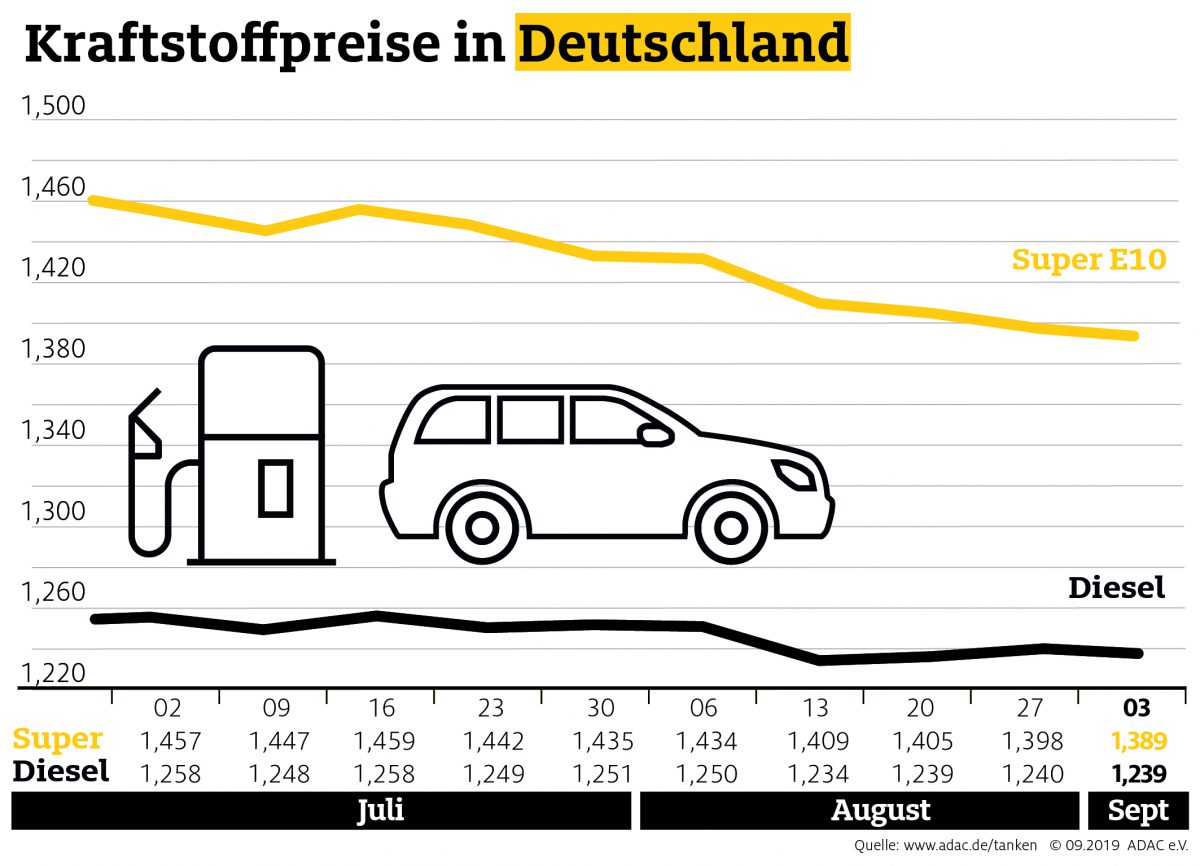 Der Rückgang der Benzinpreise setzt sich fort. Laut aktueller Auswertung des ADAC kostet ein Liter Super E10 im Bundesmittel 1,389 Euro, das sind 0,9 Cent weniger als in der Vorwoche. Bezogen auf die Durchschnittswerte ist Benzin damit die siebte Woche in Folge billiger. Gegenüber Mitte Juli ergibt sich je Liter ein Rückgang um rund sieben Cent.