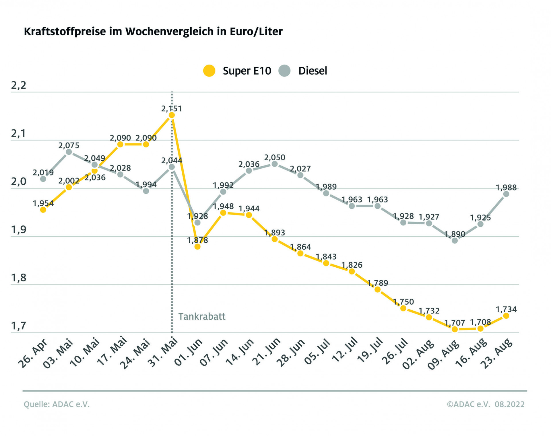 Eine Woche vor dem Auslaufen des Tankrabatts verzeichnet der ADAC im Wochenvergleich einen spürbaren Anstieg der Preise an den Zapfsäulen. Dies macht sich vor allem beim Diesel bemerkbar, der wieder an der Zwei-Euro-Grenze kratzt. Diesel kostet demnach im bundesweiten Mittel 1,988 Euro, was einem Anstieg von 6,3 Cent im Vergleich zur Vorwoche entspricht. Super E10 verteuert sich innerhalb einer Woche um 2,6 Cent und kostet im Bundesschnitt 1,734 Euro.