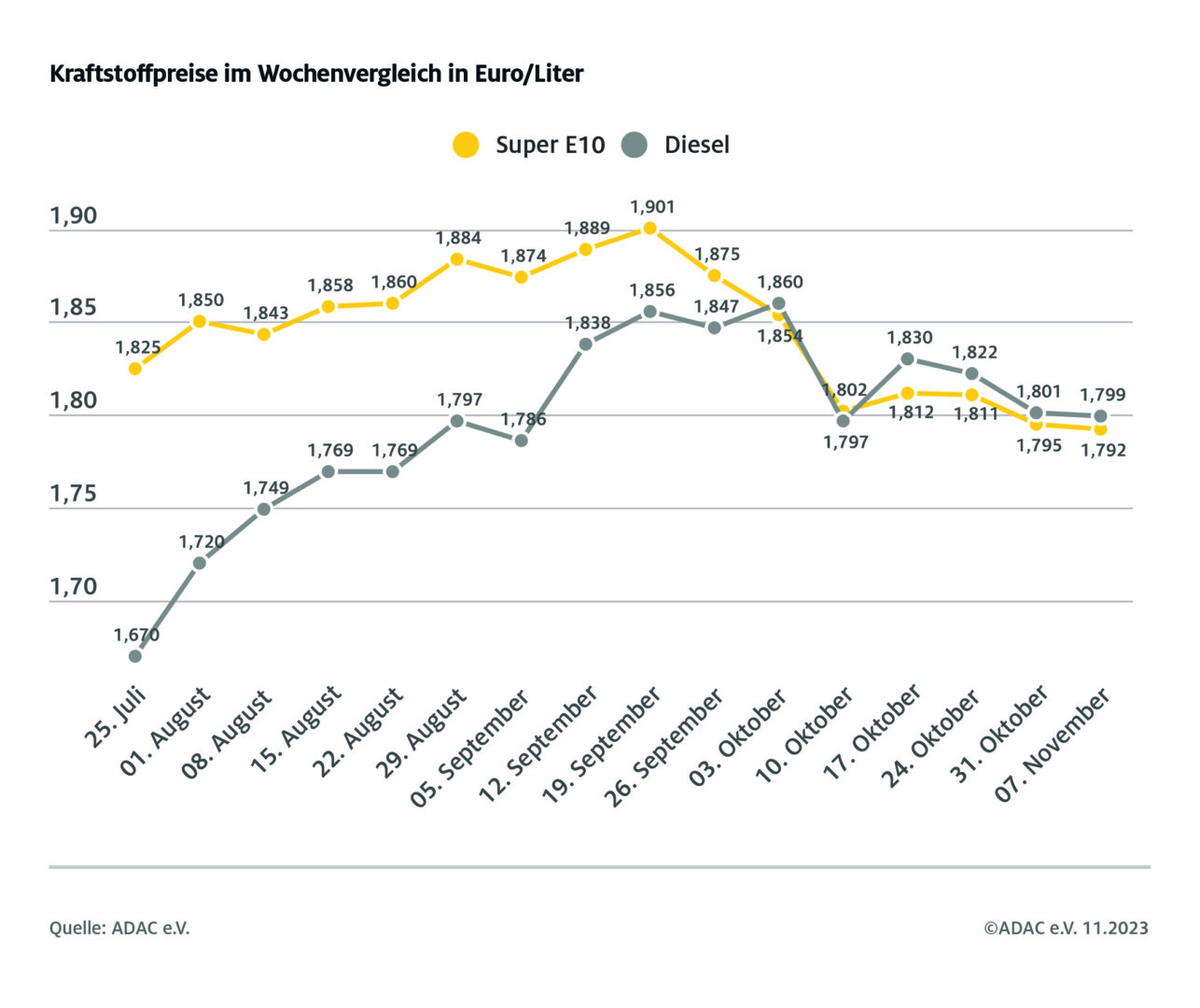 Die Kraftstoffpreise sind im Vergleich zur vergangenen Woche geringfügig gesunken und liegen aktuell sowohl für Super E10 wie für Diesel unter der Marke von 1,80 Euro. Wie die aktuelle ADAC Auswertung der Kraftstoffpreise in Deutschland zeigt, kostet ein Liter Super E10 im bundesweiten Mittel 1,792 Euro – das sind 0,3 Cent weniger als vor einer Woche. Diesel ist um 0,2 Cent billiger und liegt aktuell bei 1,799 Euro. Diesel ist damit immer noch etwas teurer als Super E10.