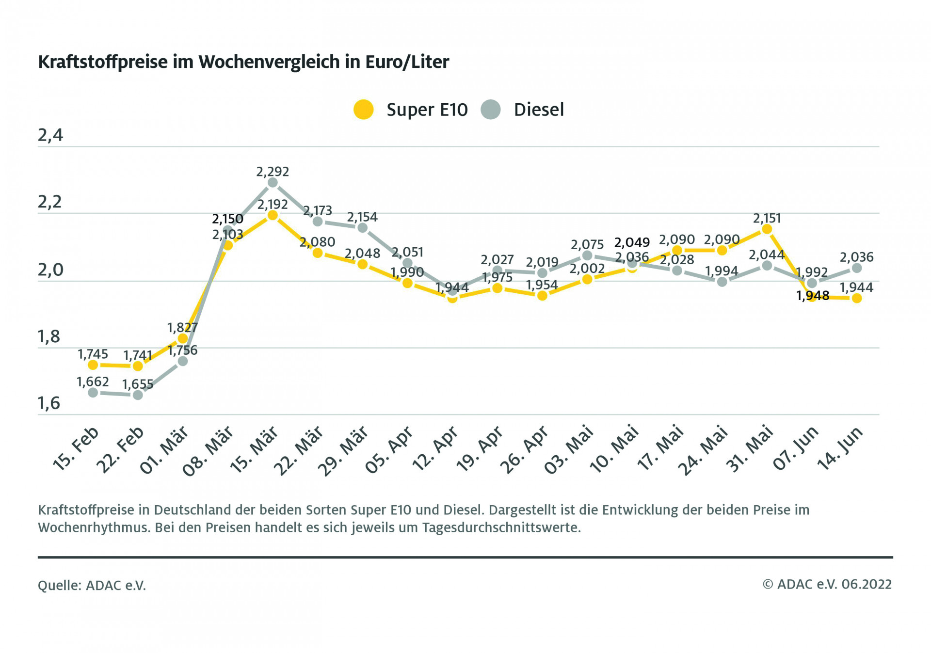Das Niveau der Kraftstoffpreise in Deutschland ist nach wie vor viel zu hoch, die Autofahrer müssen für ihre Tankrechnung weiter zu viel bezahlen. Dies zeigt die aktuelle ADAC Auswertung der Kraftstoffpreise. Danach kostet ein Liter Super E10 im bundesweiten Mittel 1,944 Euro, das sind 0,4 Cent weniger als in der Vorwoche. Der Preis für Diesel-Kraftstoff hingegen kletterte spürbar nach oben: Ein Liter kostet aktuell 2,036 Euro und damit 4,4 Cent mehr als vor Wochenfrist.
