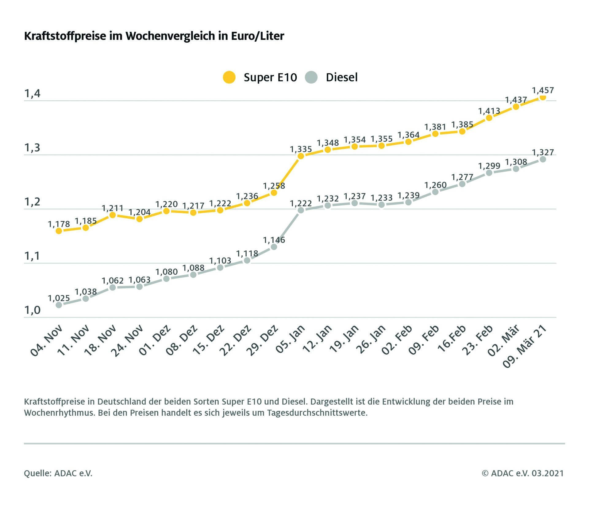 Der Benzinpreis kennt seit Wochen nur eine Richtung – nach oben. Wie die wöchentliche ADAC Auswertung der Kraftstoffpreise zeigt, hat sich der Ottokraftstoff zum 13. Mal in Folge gegenüber der Vorwoche verteuert. Ein Liter Super E10 kostet demnach 1,457 Euro im bundesweiten Mittel und ist damit um zwei Cent teurer als vor Wochenfrist.