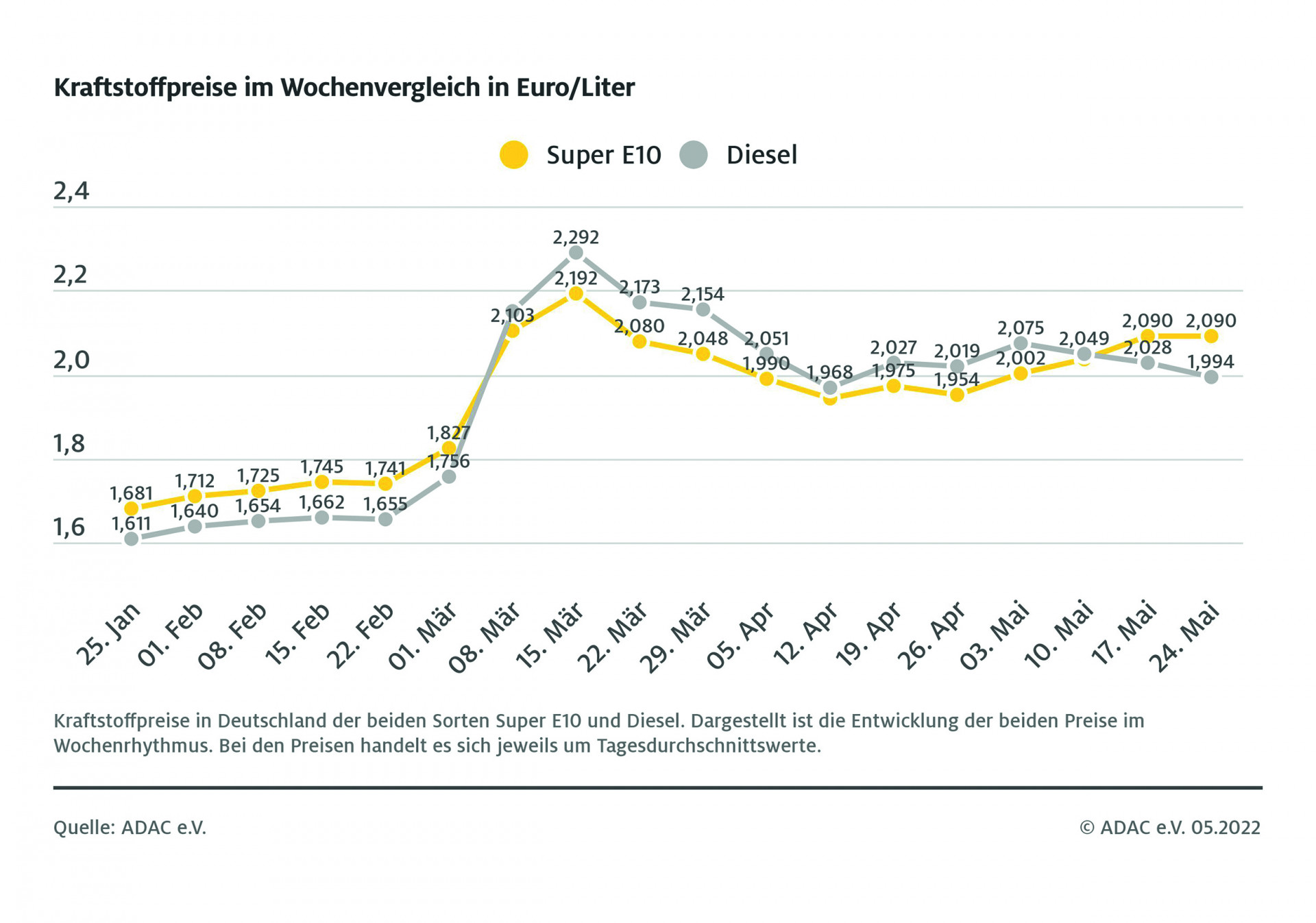 Leichte Entspannung beim Tanken für Dieselfahrer, unverändert hohe Spritpreise für die Fahrer von Benzin-Pkw. Das zeigt die wöchentliche aktuelle ADAC Auswertung der Kraftstoffpreise in Deutschland. Danach kostet ein Liter Super E10 wie in der Vorwoche 2,090 Euro. Diesel ist binnen Wochenfrist um 3,4 Cent gesunken und kostet derzeit im bundesweiten Mittel 1,994 Euro.