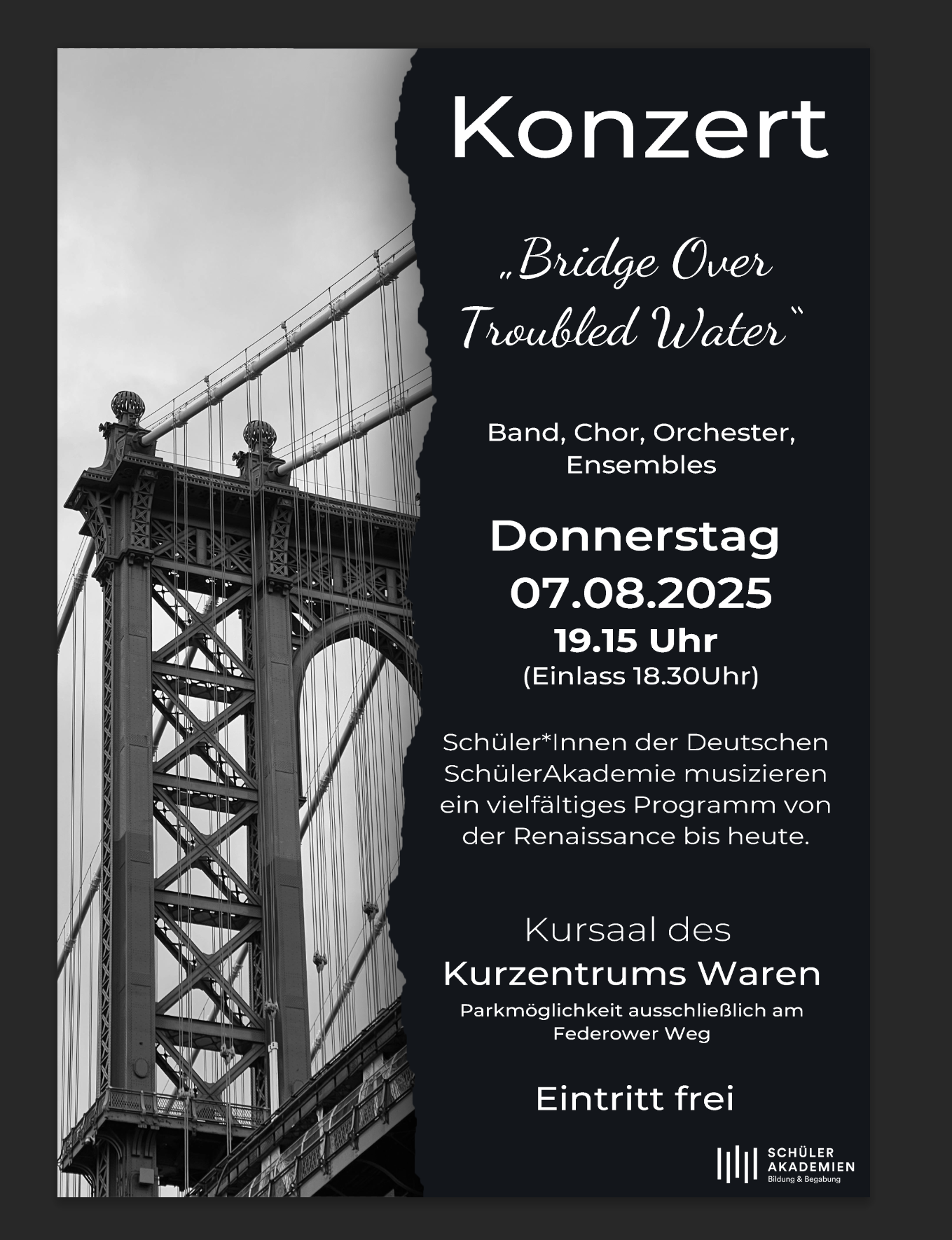 Zwei Wochen haben Jugendliche, die auf Schloss Torgelow zu Gast sind, ein vielfältiges musikalisches Programm vorbereitet, das von der Musik der Renaissance bis zu Simon and Garfunkels epischer Hymne „Bridge Over Troubled Water“ reicht. Und genau dieses Programm ist am morgigen Donnerstag, 7. August, im Kurzentrum auf dem Nesselberg zu hören. „Lassen Sie sich von den Chören, dem Orchester, der Band und verschiedenen Ensembles der Deutschen SchülerAkademie verzaubern“, laden die jungen Musiker ein. Los geht’s um 19.25 Uhr, der Eintritt ist frei.