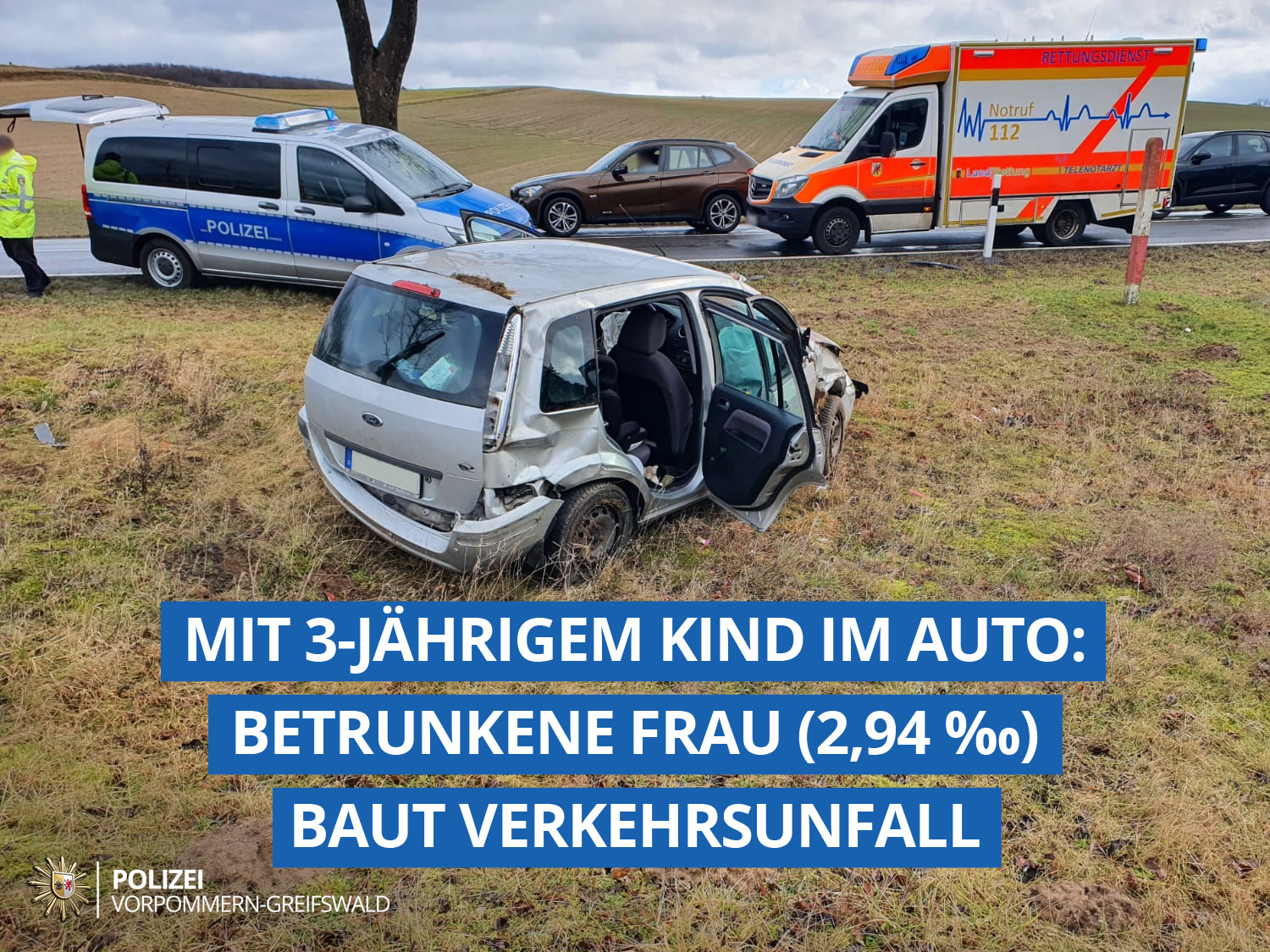 Bei einer Überprüfung des Atemalkoholwertes bestätigte sich dieser Verdacht – die Fahrerin war mit ihrem Kind im Auto mit 2,94 Promille unterwegs. Sowohl die Mutter, als auch das Kind verletzten sich augenscheinlich nicht, wurden aber vorsorglich mit einem Rettungswagen ins Universitätsklinikum nach Greifswald gebracht.