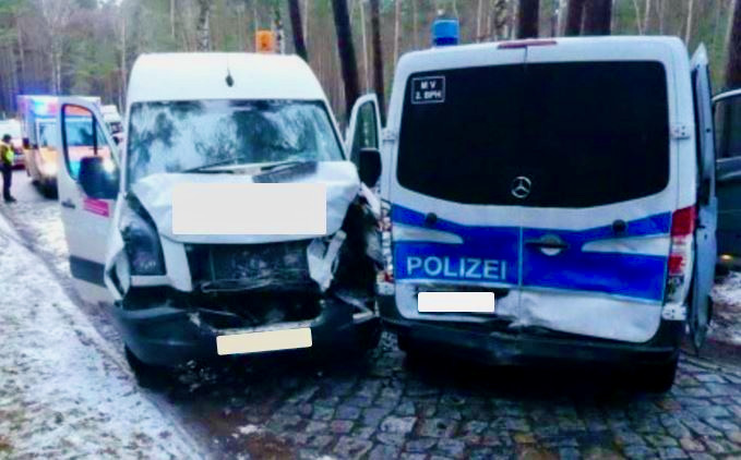 Ein Betrunkener ist bei einer Verkehrskontrolle auf der B96 nahe des Ortes Klein Trebbow im Landkreis Mecklenburgische Seenplatte mit seinem Transporter in einen Streifenwagen gekracht. Polizisten wollten den Transporter kontrollieren und wiesen das Fahrzeug in die Kontrollstelle ein. Der Transporter fuhr im weiteren Verlauf scheinbar ungebremst auf einen dort abgestellten Streifenwagen auf. Durch den Aufprall wurde der Streifenwagen weiter nach vorne gegen eine Baum gedrückt, drehte sich um 180 Grad und blieb dann stehen. Durch die ausgelösten Frontairbags im Transporter wurden der 40-jährige deutsche Fahrzeugführer sowie der 41-jährige deutsch Beifahrer leicht verletzt. Beide Personen waren augenscheinlich alkoholisiert. Ein Atemalkoholtest bei dem Fahrzeugführer ergab einen Wert von 2,57 Promille. Er musste mit zur Blutentnahme. Die Fahrzeuge waren beide nicht mehr