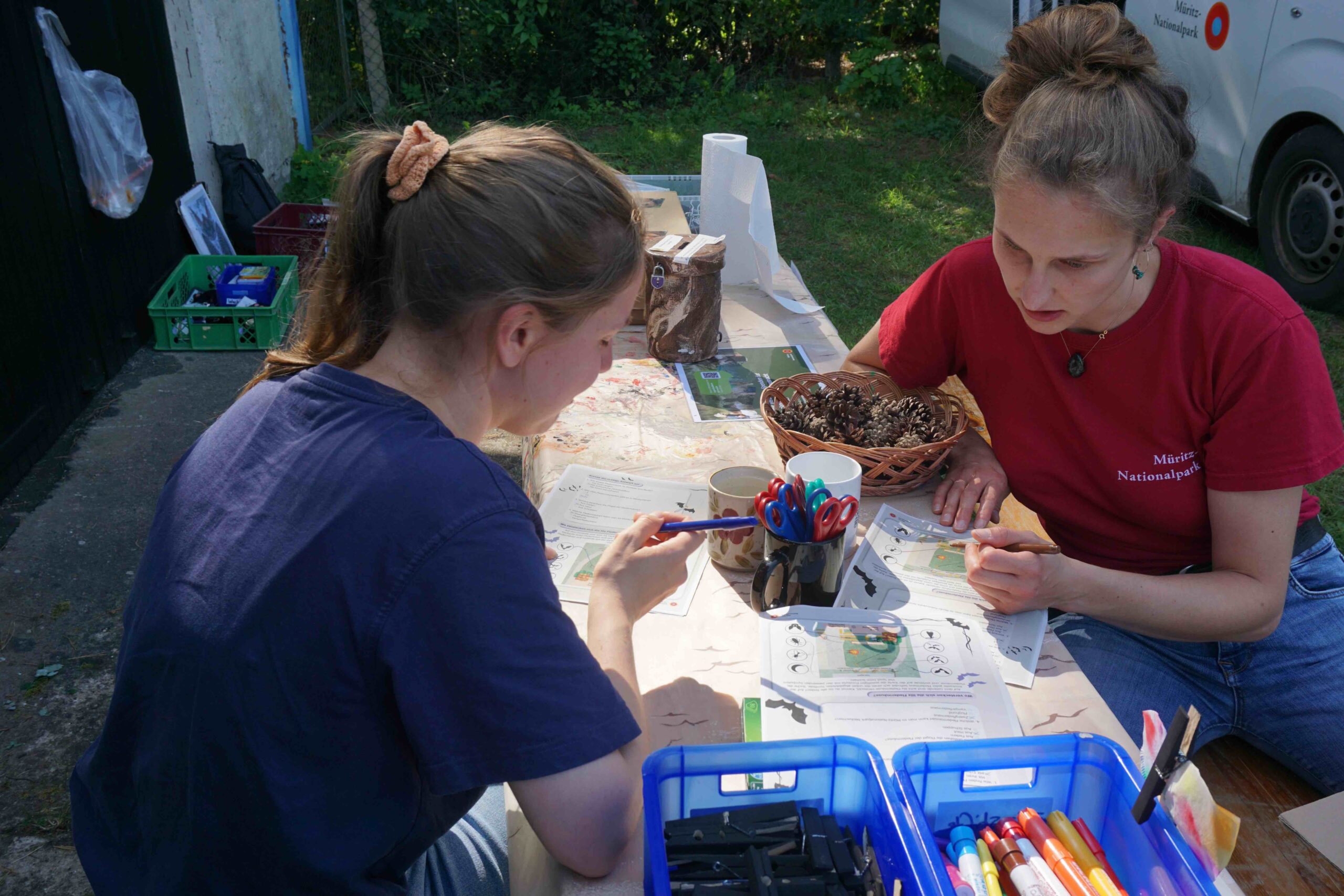 Bild: Die Umweltpraktikantinnen Ruth und Verena bereiten auf der Fledermausnacht das Quiz für die Kinder vor