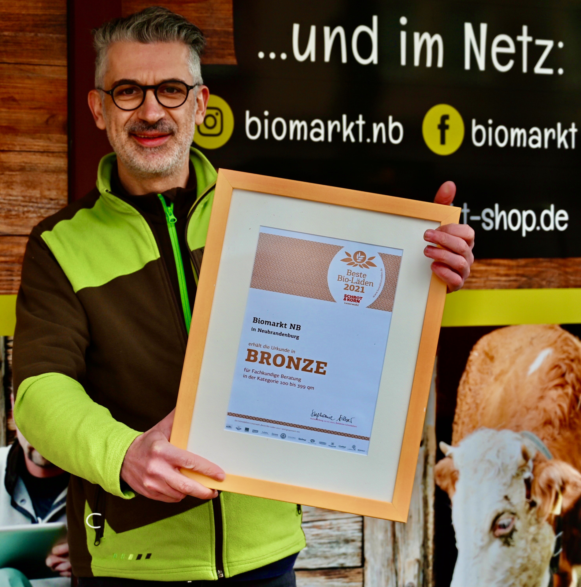 Der „Biomarkt NB“ in Neubrandenburg, in dem auch viele Müritzer sehr gerne einkaufen, ist einer der 140 besten Bio-Läden des Jahres 2021 in Deutschland. Inhaber Michael Kruse und alle Mitarbeiter freuen sich über ihre Auszeichnung in Bronze für herausragende Leistungen bei fachkundiger Beratung. Die Auszeichnung wurde ihnen aufgrund der sehr guten Bewertung durch ihre Kunden verliehen. Bereits 2010 wurde Michael Kruse mit seinem gerade damals neu eröffneten Bioladen ausgezeichnet.