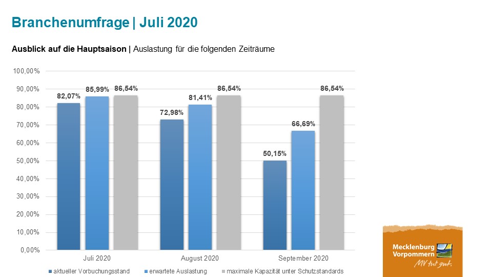 Die wirtschaftliche Lage in der Branche entspannt sich über die Sommermonate, bleibt aber in Teilen nach wie vor schwierig. Speziell für den Herbst und den Winter rechnen viele Unternehmen mit teils erheblichen wirtschaftlichen Schwierigkeiten. Zwar ist der Anteil der touristischen Betriebe in Mecklenburg-Vorpommern, die staatliche Hilfe benötigen, im Juli 2020 kleiner als in den Monaten zuvor. Waren dies im März noch 80 Prozent und im Juni rund 40 Prozent, sind es derzeit 26 Prozent.
