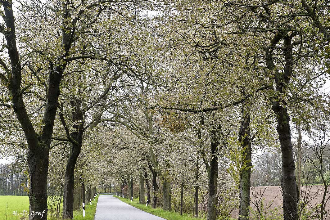 Jetzt müsste es nur noch etwas wärmer werden, damit die Bäume in dieser herrlichen Kirschenallee bei Kieve auch Früchte tragen.