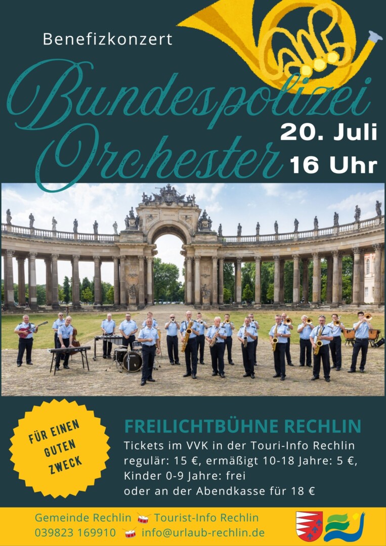 Bereits im September 2023 trat das Bundespolizeiorchester in Rechlin erstmalig auf und sammelte gemeinsam mit Gemeindevertretern und der dortigen Tourist-Info Spenden für die Rechliner Vereine. Auch in diesem Jahr konnten die Veranstalter das Orchester aus Berlin wieder für sich gewinnen. Sie stehen am kommenden Sonntag, 20. Juli, ab 16 Uhr auf der Rechliner Freilichtbühne. Diesmal soll der Erlös in die Umweltbildung gehen. Der Umwelttag wird in Rechlin zusammen mit dem Kindertag gefeiert. Diese vom Bürgermeister Wolf-Dieter Ringguth ins Leben gerufene Tradition des sogenannten „Umweltfrühstücks“ soll mit den Spendengeldern im nächsten Jahr zu einem großen Projekt werden. Ziel dieses besonderen Events soll es sein, den Kindern spielerisch und kreativ das Thema Umweltschutz näher zu bringen und ihnen den Umgang mit natürlichen Ressourcen auf unterhaltsame Weise zu vermitteln. Karten gibt es ab sofort im Vorverkauf und an der Abendkasse. Für kulinarische Genüsse sorgt der Waffelfoodtruck Quint&Quäntchen.
