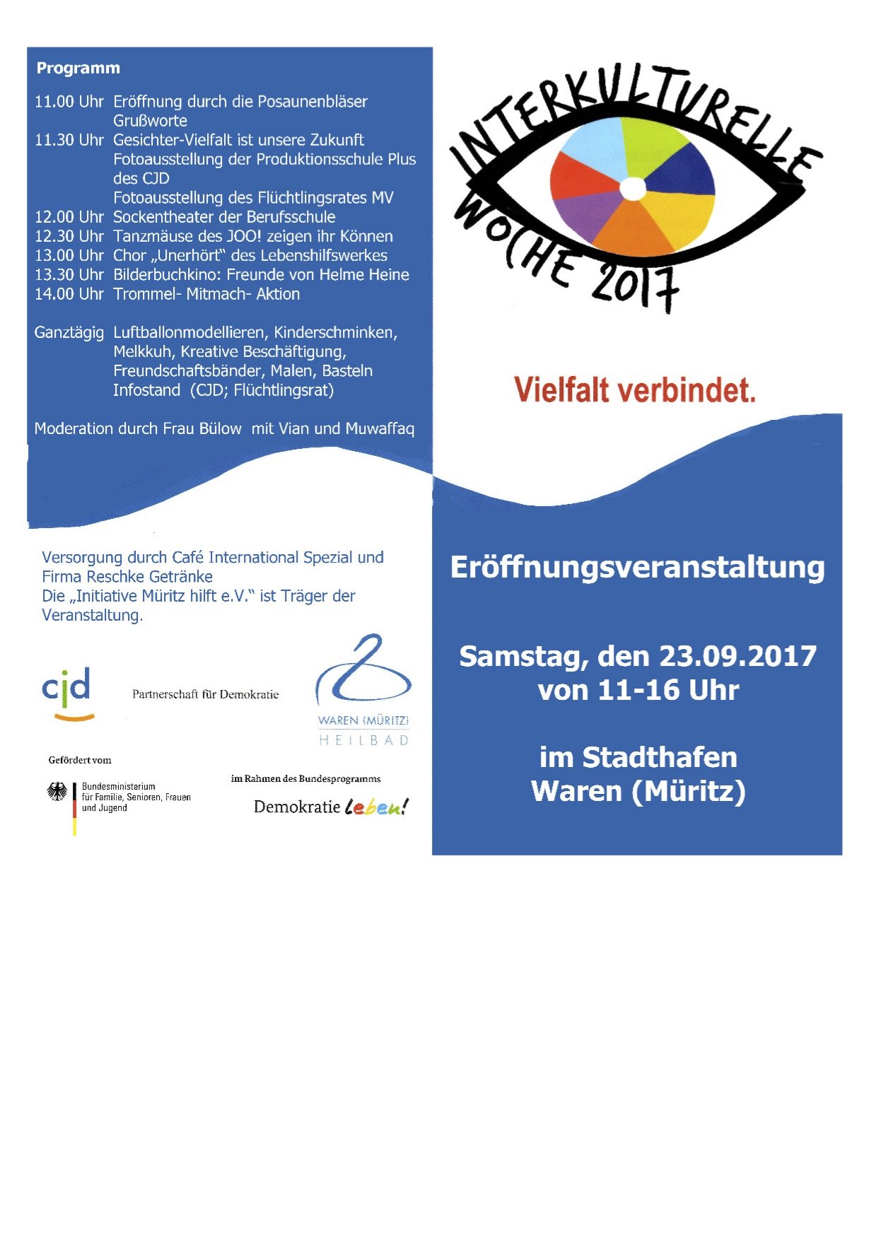Erstmalig beteiligt sich die Stadt Waren in diesem Jahr an der Interkulturellen Woche. Vor 42 Jahren wurde die Idee geboren, heute gibt es bundesweit ca. 5000 Veranstaltungen in über 550 Kommunen. Das Motto in diesem Jahr lautet: „Vielfalt verbindet“. In Waren ist dazu morgen am Hafen ein buntes Programm geplant.