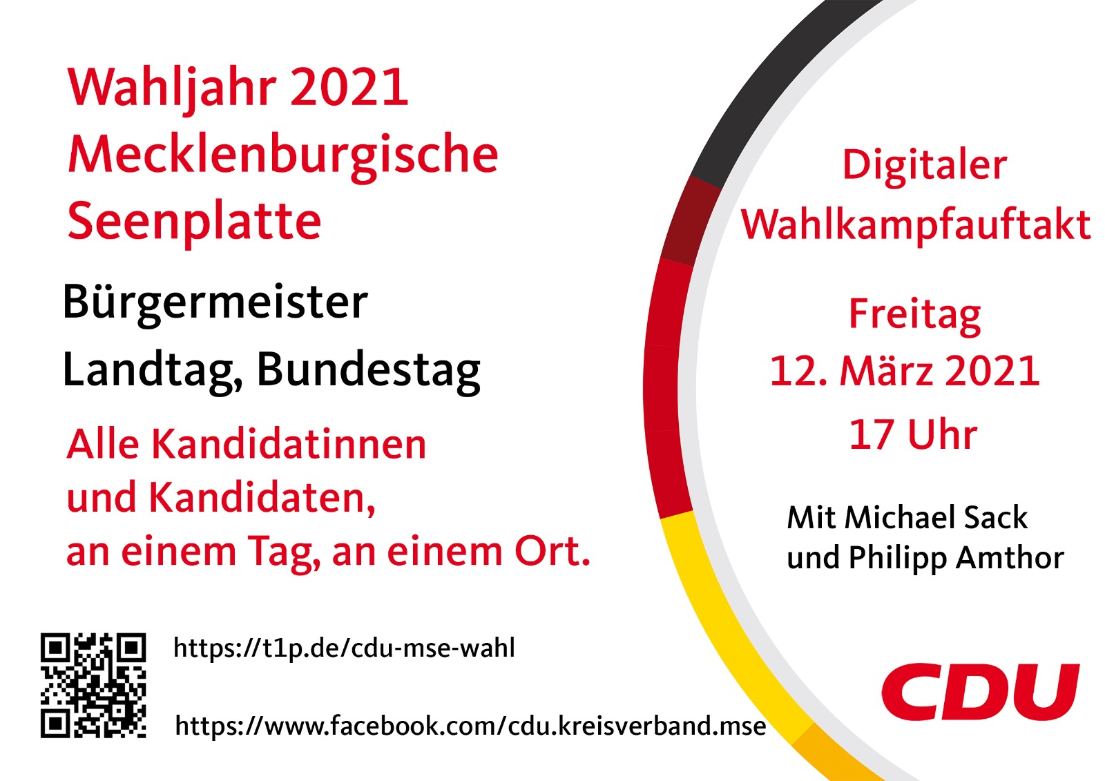 Am morgigen Freitag, 12. März, startet die CDU an der Mecklenburgischen Seenplatte in das Superwahljahr 2021. Dazu sind alle interessierten Bürger eingeladen. Ab 17 Uhr präsentieren sich die Kandidaten der CDU für die unterschiedlichen Urnengänge in diesem Jahr beim digitalen Wahlkampfauftakt. Dabei kann das abwechslungsreiche Programm bequem vom heimischen Sofa aus verfolgt werden. Neben dem Livestream über die Facebook-Seite der CDU MSE wird der digitale Wahlkampfauftakt auch auf der Videokonferenz-Plattform Webex übertragen.