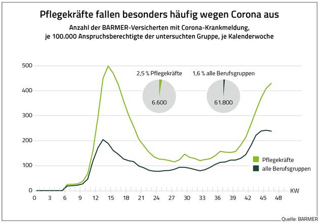Besonders deutlich tritt das Corona-bedingte Risiko für Pflegekräfte in der Wochenauswertung der Barmer-Analyse zutage. Demnach waren während der ersten Pandemie-Welle in der Spitze 499 je 100.000 Pflegekräfte wegen Corona krankgeschrieben. Bei allen Erwerbstätigen waren es maximal 204 je 100.000 Versicherte mit Krankengeldanspruch. Nach niedrigen Raten im Sommer sind die Krankschreibungen im Herbst wieder angestiegen. In der zweiten Corona-Welle sind Mitte November bis zu 410 je 100.000 Pflegekräfte in einer Woche wegen Corona krankgemeldet gewesen. Bei allen Erwerbstätigen hat dies auf bis zu 242 von 100.000 Versicherten mit Krankengeldanspruch zugetroffen.