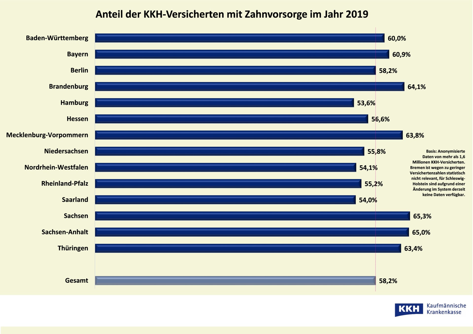 In den Jahren vor der Pandemie war die Bereitschaft zur Zahnvorsorge hingegen immer stagniert. 2019 und 2018 suchten 64 Prozent der KKH-Versicherten in MV mindestens einmal den Zahnarzt zur Kontrolle auf, 2014 waren es 66 Prozent. Im Ländervergleich liegt MV damit aktuell auf Platz vier. Spitzenreiter bei der Zahnvorsorge sind seit Jahren die KKH-Versicherten in Sachsen. In Hamburg gehen hingegen die wenigsten Menschen zur jährlichen Zahnkontrolle.