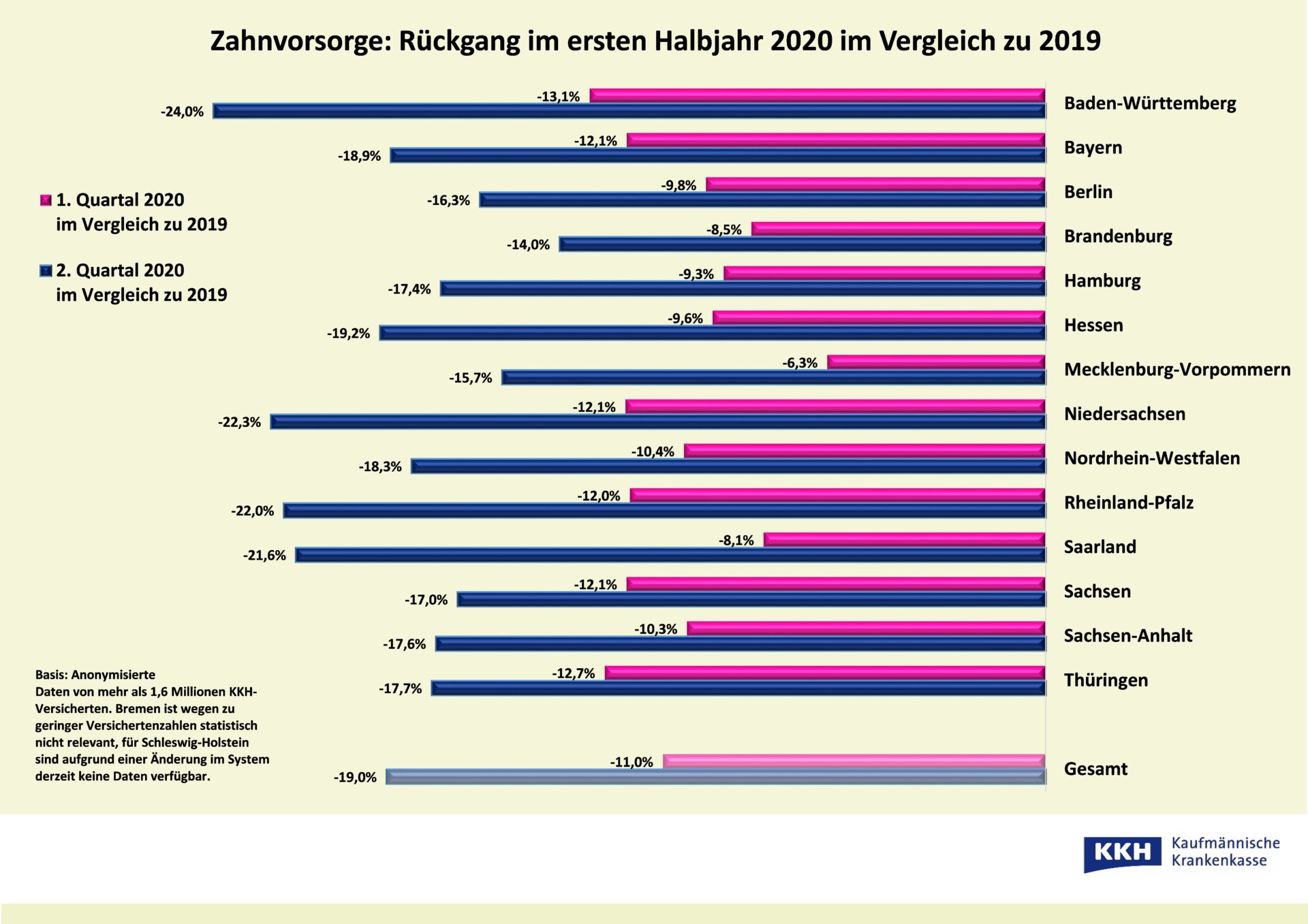 Verschobene Vorsorgeuntersuchungen aus Angst vor dem Corona-Virus: Seit der Krise trauen sich viele Menschen in Mecklenburg-Vorpommern nicht mehr zum Zahnarzt. Aktuelle Daten der KKH Kaufmännische Krankenkasse anlässlich des Tages der Zahnschmerzen am 9. Februar 2021 zeigen, dass die Bereitschaft zur Zahnvorsorge in der Pandemie so stark zurückgegangen ist wie seit Jahren nicht: In MV sank die Zahl der KKH-Versicherten mit Zahnvorsorge im ersten Quartal 2020 im Vergleich zum Vorjahreszeitraum um mehr als 6 Prozent. Im zweiten Quartal, also von April bis Juni, nahmen sogar rund 16 Prozent weniger Versicherte einen Kontrolltermin beim Zahnarzt war.