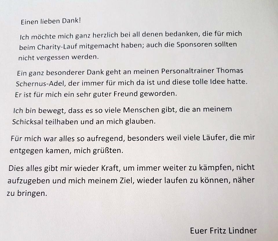 Wir haben einen netten Brief von Fritz bekommen. Sie erinnern sich: Beim Run for Charity sind gleich mehrere Staffeln für Fritz gelaufen.
