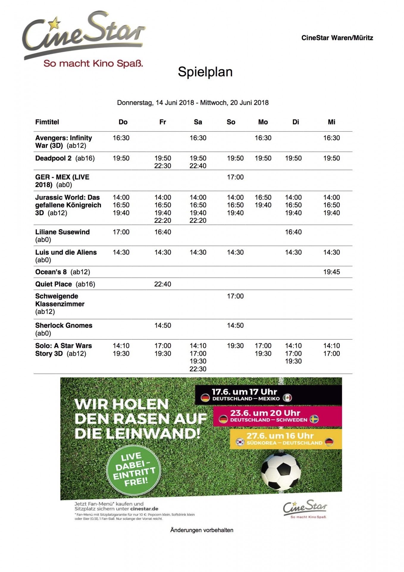 Und: Das Warener CineStar überträgt die Länderspiele der deutschen Nationalmannschaft (alle Gruppenspiele und unabhängig von deutscher Beteiligung auch beide Halbfinals und das Finale).