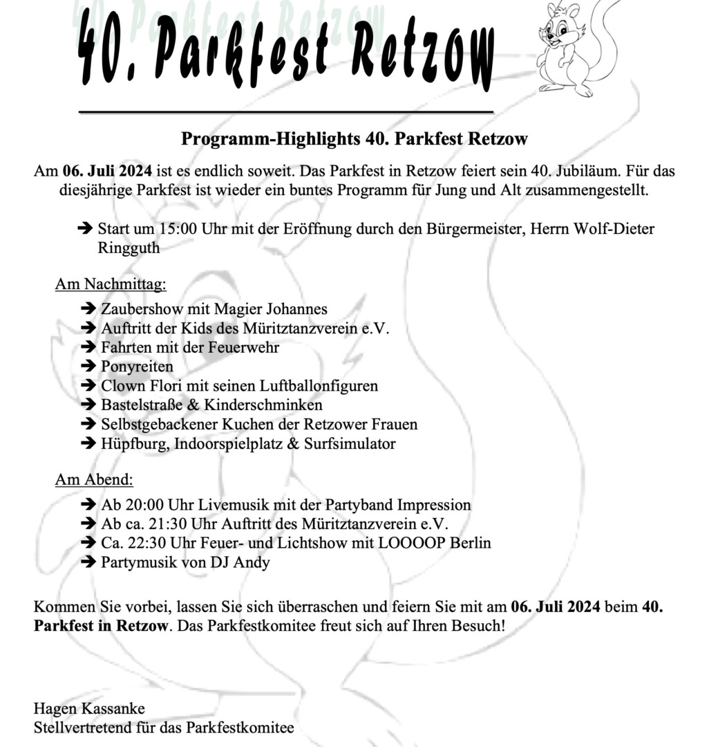 Auch in diesem Jahr findet im Ortsteil Retzow der Gemeinde Rechlin das beliebte Parkfest statt. Am Sonnabend, 6. Juli, gibt’s im Park zu Retzow jede Menge Attraktionen und Überraschungen. In diesem Jahr steht nämlich ein besonderes Ereignis an – das Parkfest feiert seinen 40. Geburtstag.