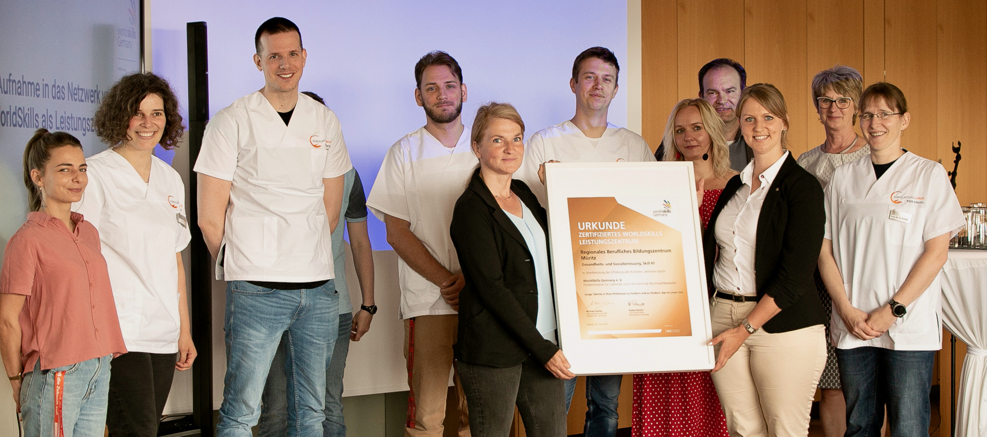 Ein weiterer Höhepunkt der Veranstaltung war die Aufnahme in das Netzwerk der WorldSkills Germany als erstes Leistungszentrum Skill 41 durch die Geschäftsstellenleiterin Frau Hermann. WorldSkills Germany ist eine global vernetzte Organisation, die den nationalen und internationalen Austausch vieler verschiedener Bildungsgänge fördern möchte. Ein wesentlicher Bestandteil der Arbeit ist die Durchführung von Berufswettbewerben auf regionaler, nationaler und internationaler Ebene. Das „Lernen von den Besten der Welt – mit Spaß am Beruf“ (WorldSkills 2002) steht im Fokus dieser Berufswettbewerbe. Mit der Aufnahme in das Netzwerk von WorldSkills Germany qualifiziert sich nun auch das RBB Müritz für die Durchführung von regionalen, nationalen und internationalen Berufswettbewerben in der Pflege. In die Durchführung dieser Wettbewerbe wird dann auch das SimLab einen wesentlichen Platz einnehmen.