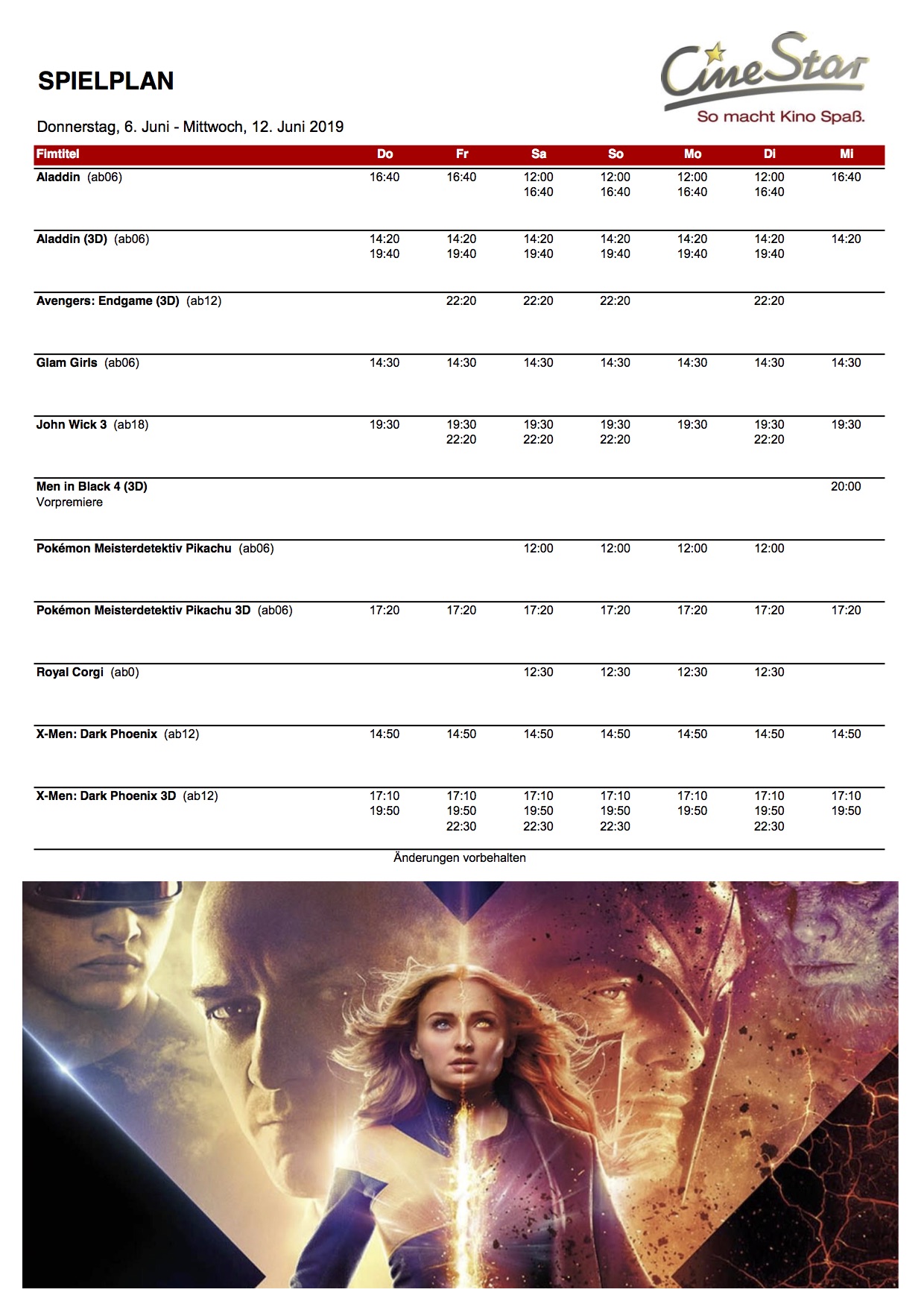 Der ab heute gültige Spielplan für das CineStar in Waren mit dem Neustart: „X-Men: Dark Phoenix“ in 2D & 3D und der Sondervorstellung: Vorpremiere 12.06. um 20 Uhr “Men in Black 4” in 3D