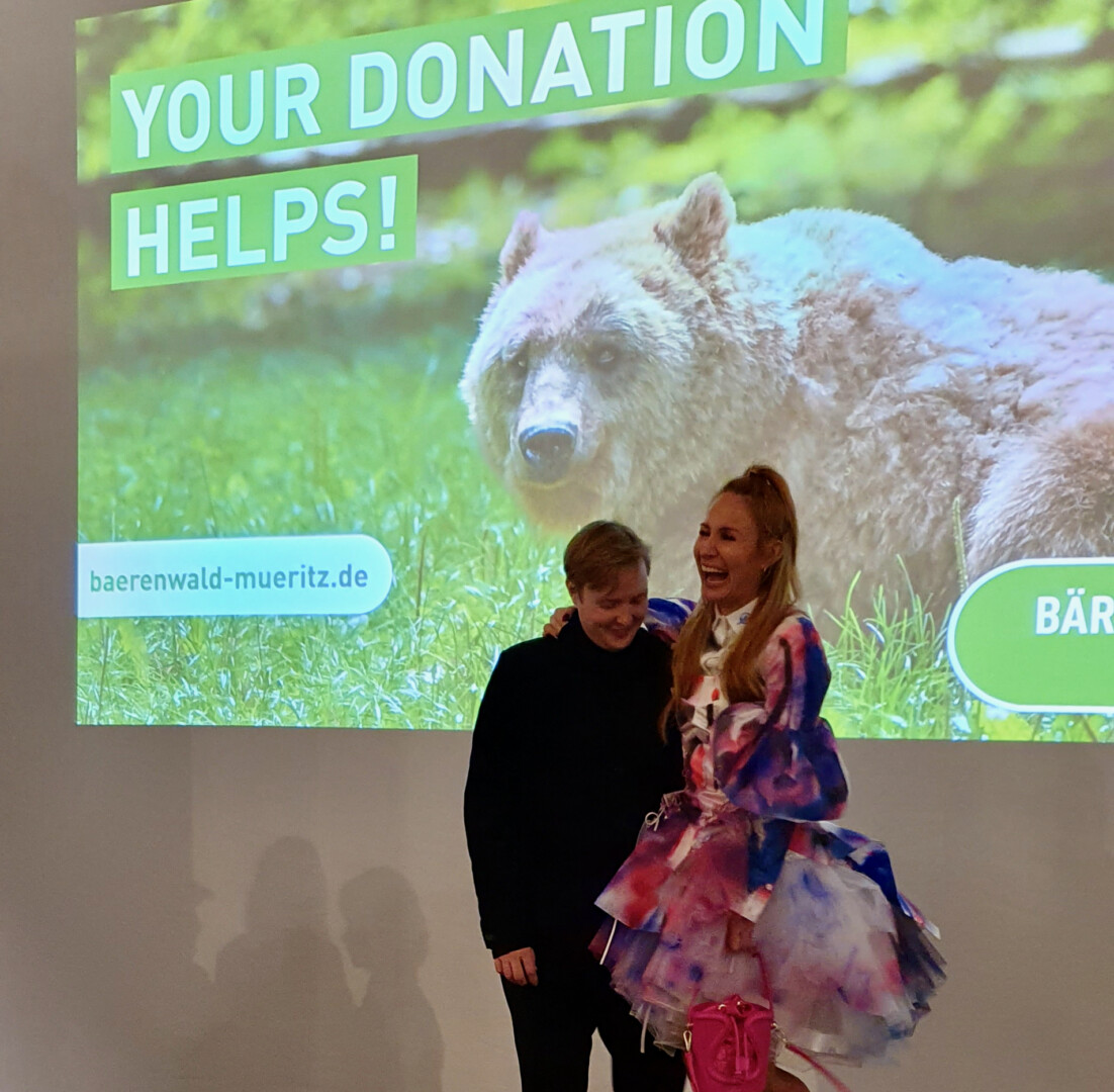 Anschließend bat der Designer um Spenden für den Bärenwald und verteilte während seiner Show zudem Flyer über das Projekt.