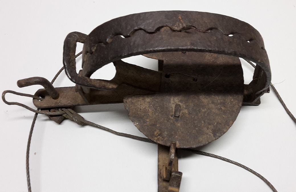 Bei dem Tellereisen, auch Fangeisen genannt, handelt es sich um eine verbotene Falle zum Fang von Raubtieren. Die Klaue eines Tellereisens ist, wie auch im vorliegenden Fall, an einer längeren Metallschnur befestigt. Am Ende jener Schnur befindet sich ein Mechanismus, der an einem starren Gegenstand befestigt wird, wie beispielsweise einem Baum, so dass das gefangene Tier örtlich gebunden ist.