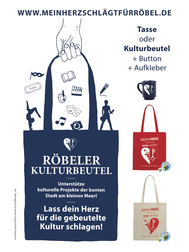 Vor genau einem Jahr stand die ohnehin schon „gebeutelte Kultur“ mit der Absage von Weihnachtsmärkten und anderen Veranstaltungen wiederholt vor einer Pause. Doch das Herzblut der Röbeler Kulturschaffenden war und ist ungebrochen. Der „Röbeler Kulturbeutel“ wurde als Idee geboren, durch Erlöse aus dem Verkauf des praktischen Schmuckstücks Kulturprojekte zu fördern. Mit Erfolg, denn mit Hilfe vieler Röbeler Gewerbetreibenden wurden insgesamt 440 Beutel verkauft, deren Erlös wiederum als zusätzliches Budget für kulturelle Projekte zur Verfügung stand. Ein Beutel, im übertragenen Sinne ein „Trägermedium“, das dank vieler interessierter Käufer gezeigt hat, wie sehr die Herzen für Röbel/Müritz schlugen und schlagen. Jetzt ist der „Kulturbeutel“ wieder da.