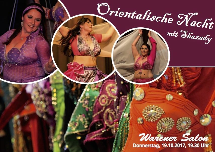 Es wird orientalisch zum Auftakt der neuen Saison 2017/2018 des Warener Salons im Haus des Gastes in Waren. Am morgigen Donnerstag, den 19. Oktober, wird die Tanzgruppe um Trainerin Anja Möller alias „Shazady“ aus Malchow die Besucher ab 19.30 Uhr im Haus des Gastes verzaubern und auf eine musikalisch-tänzerische Reise in den Orient mitnehmen.
