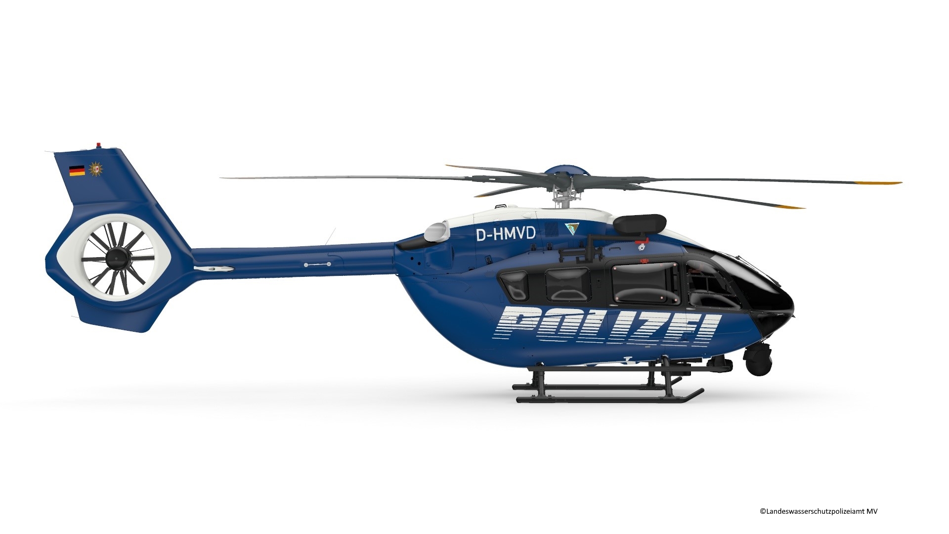 Die Beschaffung der zwei neuen Hubschraubern H 145 für die Landespolizei Mecklenburg-Vorpommern gemeinsam mit dem Land Niedersachsen läuft auf Hochtouren. „Wir kommen bei der Modernisierung unserer Landespolizei zügig voran. Nachdem die technischen Eckdaten und die polizeilich notwendige Ausrüstung festgelegt worden sind, steht nun das neue Design fest“, so Innenminister Christian Pegel. Bei der Gestaltung war unter anderem zu beachten, dass durch die Verwendung der blauen Grundfarbe die Hubschrauber klar als polizeiliches Einsatzmittel zu erkennen sind. Dies wird durch den großflächigen Schriftzug „POLIZEI“ mit einer modernen Formgebung unterstützt. Der markante Schriftzug wurde bereits bei dem Vorgängermodell Eurocopter EC 135 verwendet und machte die Polizeihubschrauber der Landespolizei seit deren Einführung im Jahr 1999 bundesweit bekannt.