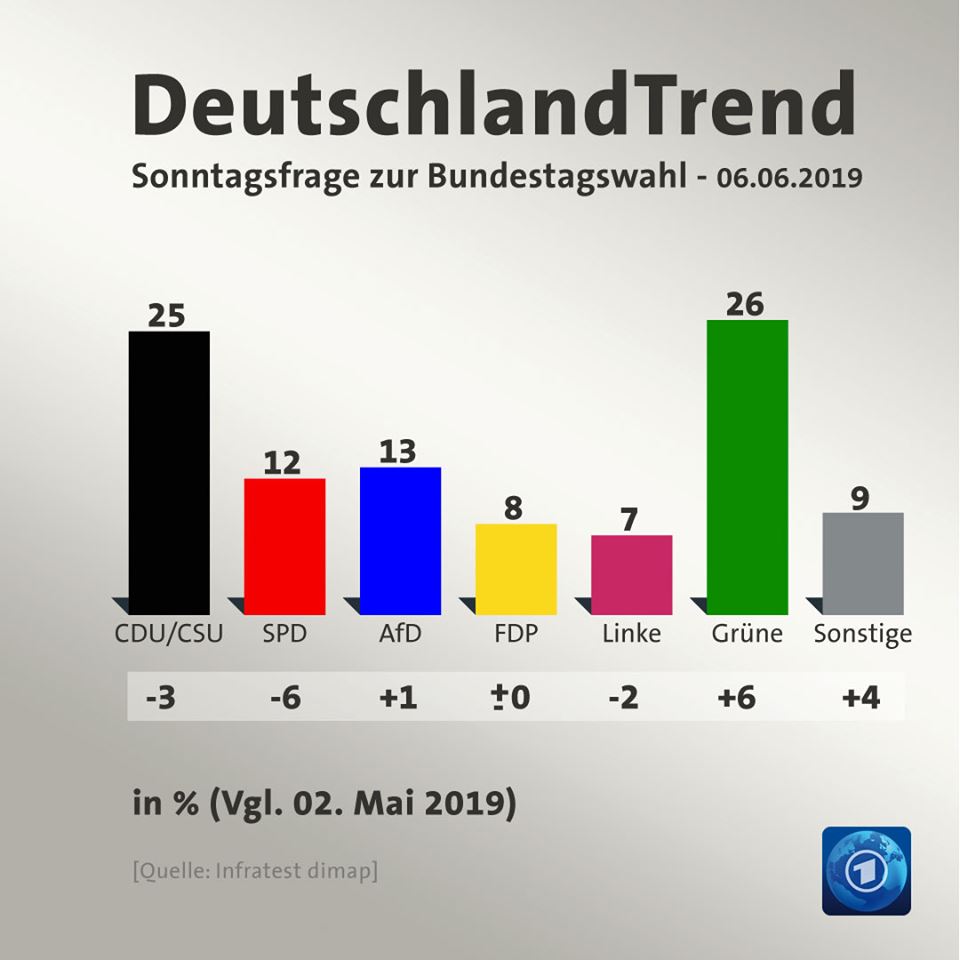 Die Europawahl endete mit historischen Tiefständen für Union und SPD, während die Grünen einen Rekordwert erzielten. Auch in der aktuellen Sonntagsfrage gibt es deutliche Veränderung im Vergleich zum ARD-DeutschlandTrend im Vormonat. Die Union verliert drei Prozentpunkte und kommt auf 25 Prozent. Die SPD verliert sechs Punkte und liegt bei 12 Prozent. Die AfD gewinnt einen Punkt und erreicht 13 Prozent. Die FDP bleibt unverändert bei 8 Prozent, die Linke verliert zwei Punkte und liegt bei 7 Prozent. Die Grünen gewinnen sechs Punkte und kommen auf 26 Prozent.