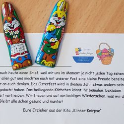 Eine besondere Aktion haben sich die Erzieherinnen für alle „Klinker Knirpse“ auf das bevorstehende Osterfest ausgedacht. 70 geschriebene Briefe, Bastelanleitungen für Osterkörbchen und kleine Schokohasen wurden verpackt und als „Postwurfsendungen“ den Familien zugestellt. So freuen sich auch die Mädchen und Jungen, die jetzt nicht mit ihren Freunden spielen können und zu Hause sind.