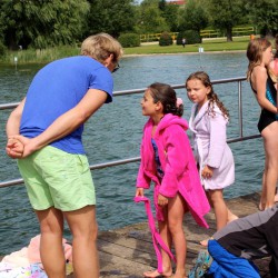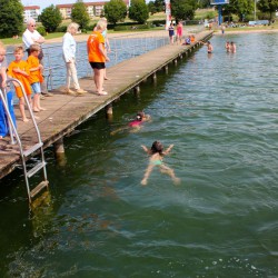 Während das Gros der Kids – einige waren schon mehrfach beim SKV-Camp dabei – das Seepferdchen ablegte, haben andere die Bronze-, Silber- und sogar die Goldstufe gemeistert. Für die „Goldene“ mussten die Jugendlichen unter anderem 600 Meter in einer bestimmten Zeit schwimmen, 50 Meter Brustschwimmen als Sprint, 15 Meter Streckentauchen sowie 50 Meter Transportschwimmen (schieben, ziehen). Gepackt haben das Jasmin Ruthenberg, Tim Müller, Elisa Goetzke und Fenja Brach. Silber holten sich Sophie Seyfert und Ashley Kanwischer.