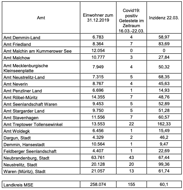 Auch am heutigen Dienstag gibt’s von der Kreisverwaltung wieder die Inzidenzzahlen für die einzelnen Städte und Ämter an der Mecklenburgischen Seenplatte. Den aktuellen Zahlen zufolge hat derzeit das Amt Treptower Tollensewinkel mit 162,33 mit Abstand die höchste Inzidenz im Kreis. Das Amt Malchow meldet eine Inzidenz von 27,84, das Amt Penzliner Land von 14,93, das Amt Röbel Müritz von 48,76, das Amt Seenlandschaft Waren von 52,89 und die Stadt Waren von 61,74.