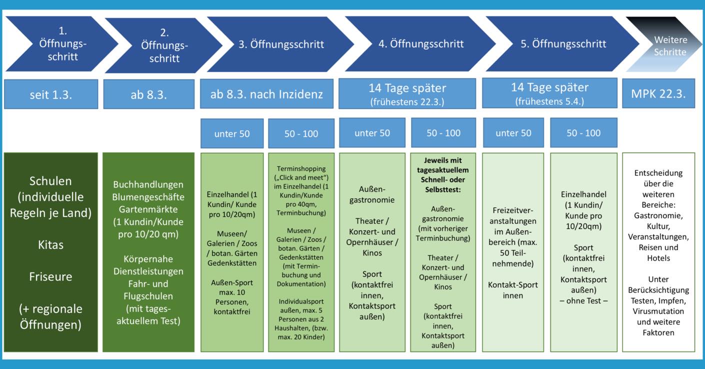 Das sind die gestern beschlossenen Öffnungsschritte in der Übersicht.