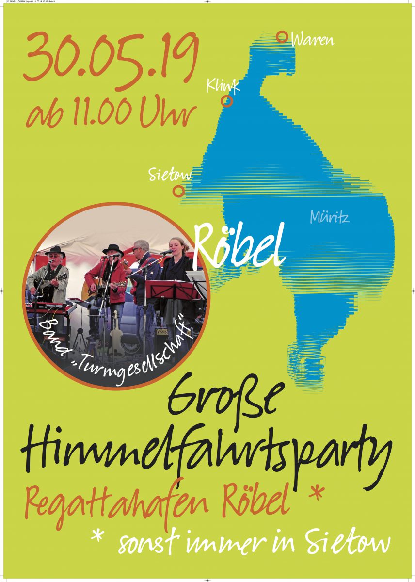 Am morgigen Himmelfahrtstag steigt am Regattahafen in Röbel um 11 Uhr eine große Party. Mit dabei ist auch die Band „Turmgesellschaft“ die eine lange Geschichte hat. Sie ist die ehemalige Band der Martin-Luther-Universität Halle. Die Musiker lernten sich während ihres Studiums kennen, machten gemeinsam Musik und avancierten schnell zur beliebten Studentenband mit Profi-Ambitionen. Nach 20 Jahren trafen sich die Musiker wieder, begeisterten zunächst in Halle und im Harz mit ihrer „Mugge“ und sei 2006 auch an der Müritz.