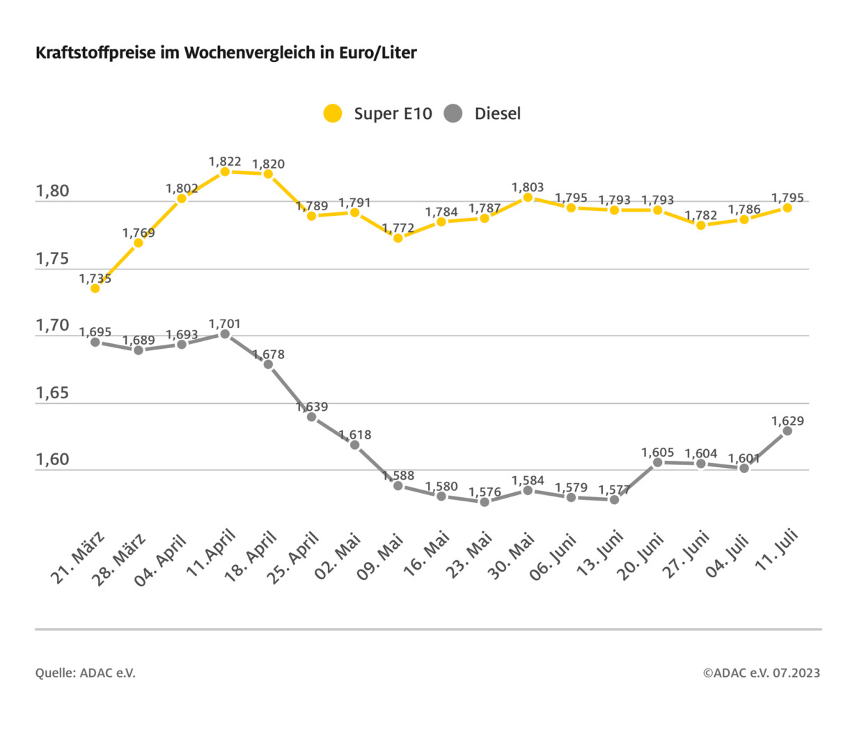 Ursache für die aktuelle Verteuerung sind in erster Linie die höheren Rohölnotierungen. So kletterte der Preis für ein Barrel (159 Liter) Rohöl der Sorte Brent seit der Vorwoche von rund 76 auf über 79 US-Dollar. Der Euro zeigt sich im Vergleich zur Vorwoche etwas fester bei aktuell 1,10 US-Dollar. Dass speziell der Dieselpreis im Wochenvergleich deutlich gestiegen ist, könnte laut ADAC auch an der aktuell höheren Heizölnachfrage liegen. Diese setzt normalerweise erst im Herbst ein. Aufgrund der unklaren Preissituation im vergangenen Jahr holen aber viele Verbraucher ihren ursprünglich für 2022 geplanten Kauf von Heizöl offenbar erst in diesem Sommer nach.