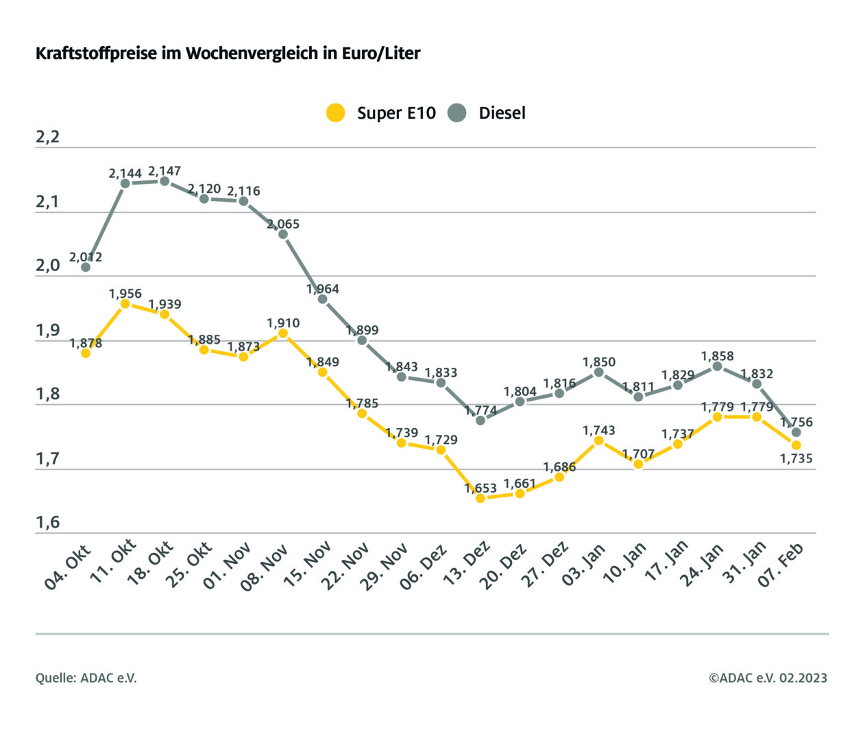 Deutliche Entspannung am Kraftstoffmarkt, vor allem aber für die Fahrer von Diesel-Pkw: Wie die aktuelle ADAC-Auswertung der Kraftstoffpreise zeigt, kostet ein Liter Diesel im bundesweiten Mittel 1,756 Euro, das sind 7,6 Cent weniger als in der Vorwoche. Auch Benzin hat sich verbilligt. Ein Liter Super E10 kostet aktuell im Schnitt 1,735 Euro – ein Minus von 4,4 Cent.