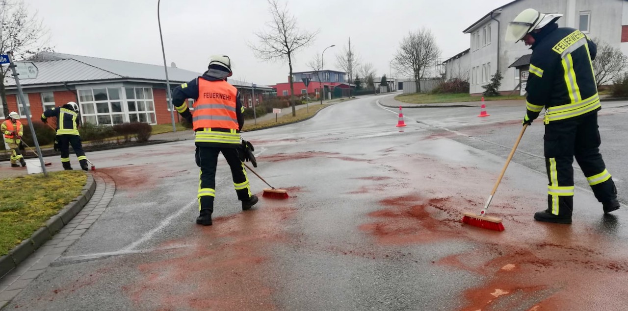 Einsatz für die Warener Feuerwehr: Die Kameraden mussten eine Dieselspur in der Heinrich-Seidel-Straße beseitigen. Ursache war ein Pkw, der vermutlich wegen eines Marder-Bisses ein Leck hatte.