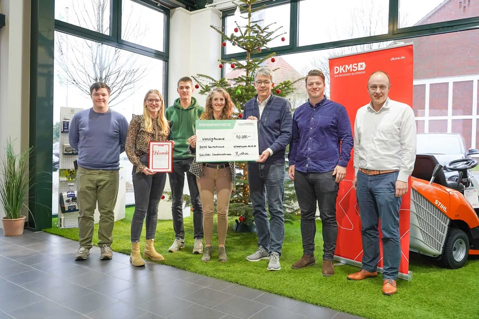 Foto: von rechts Carsten, Dennis und Bernd Schröder, Sonja Finka von der DKMS Deutschland, sowie die Auszubildenden Jaron Töllner, Nane Schlesier und Tom Gottwald.