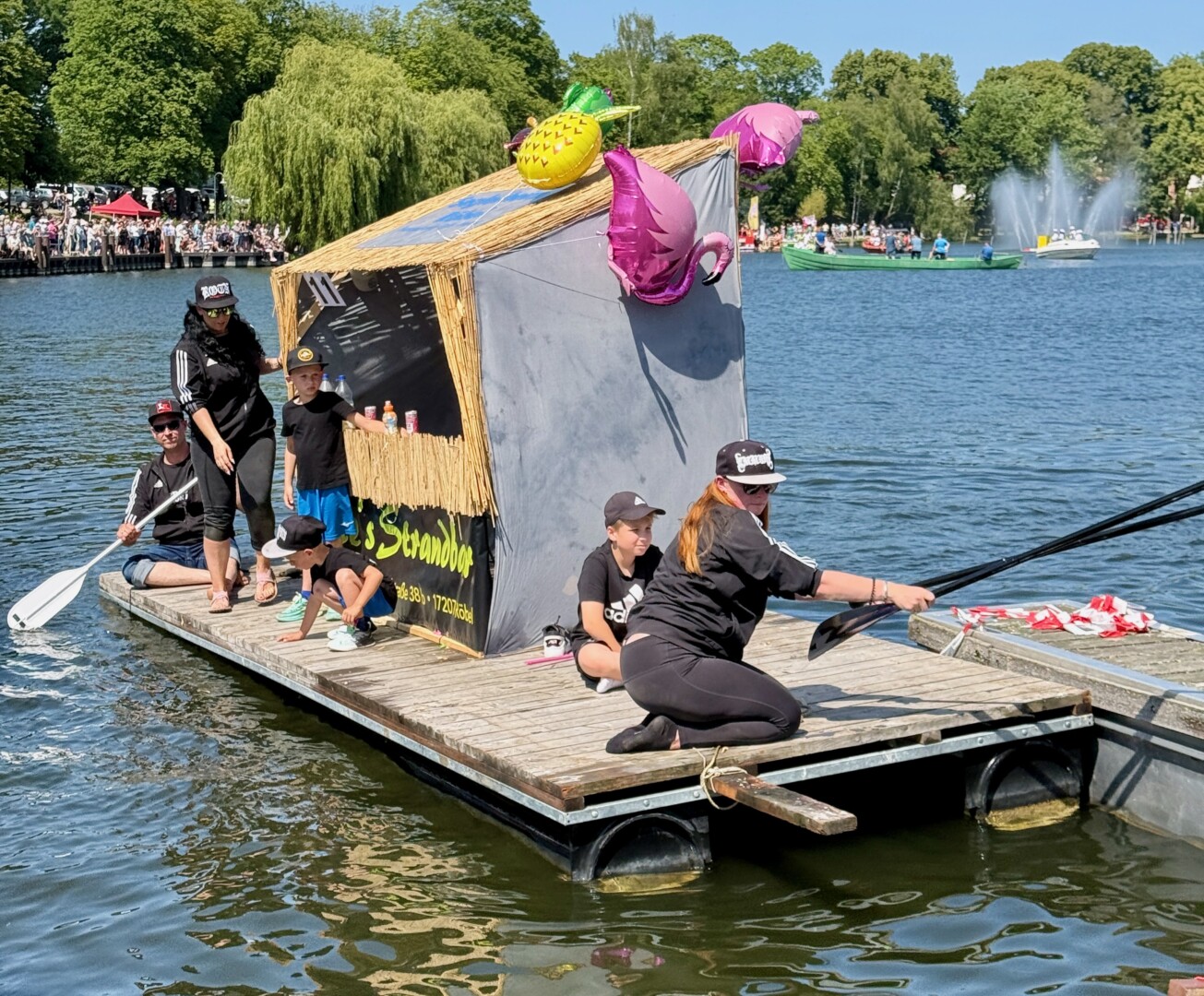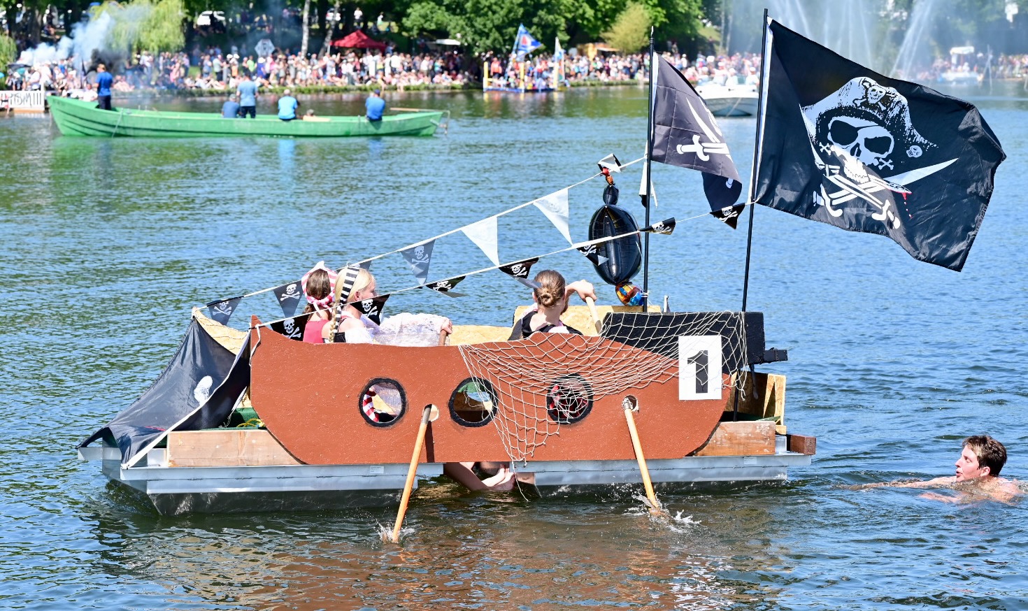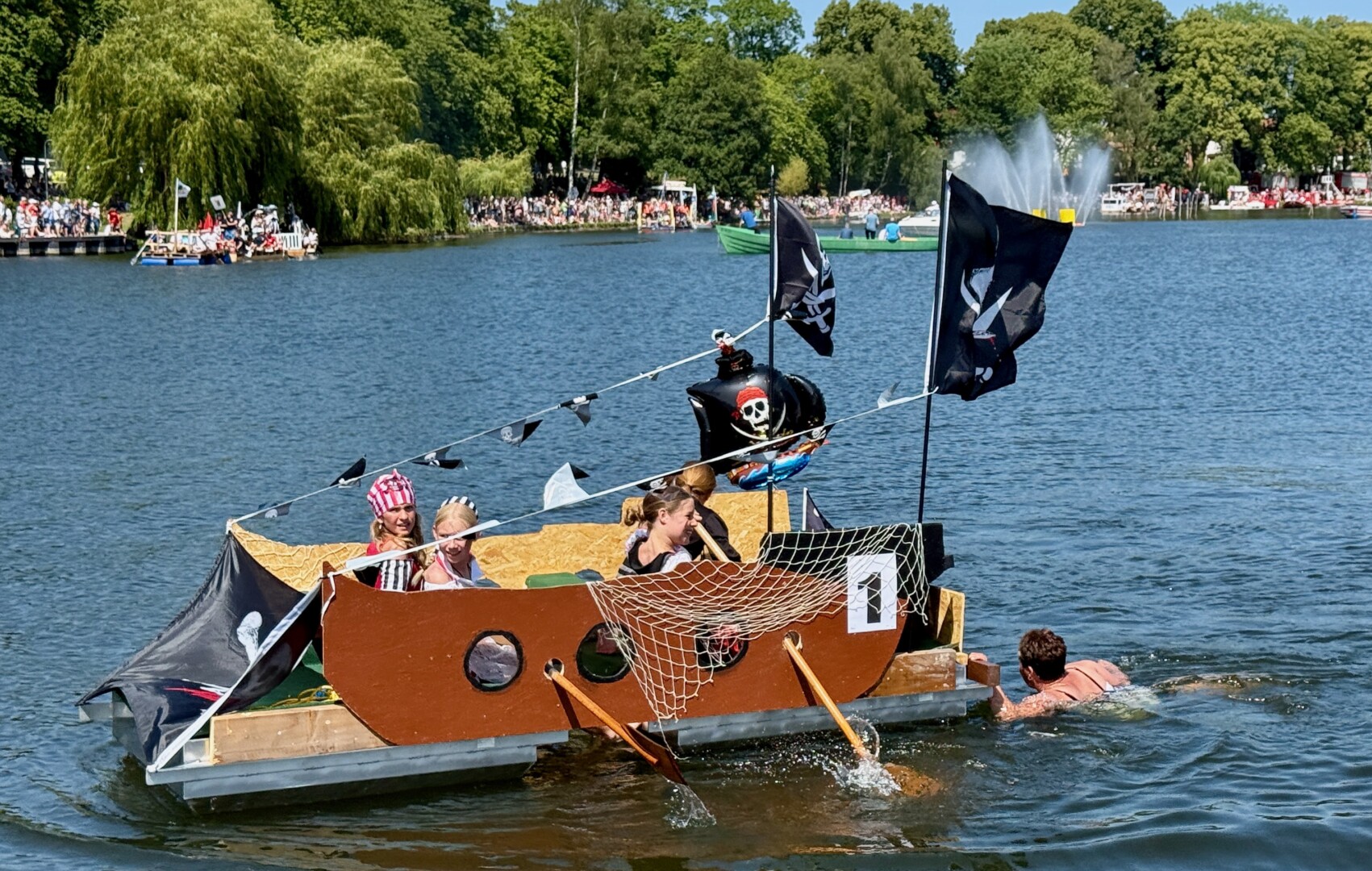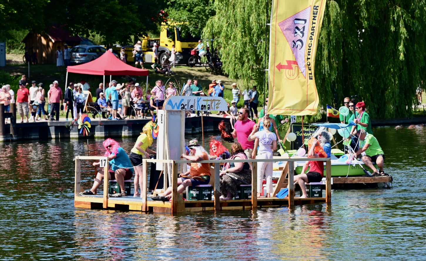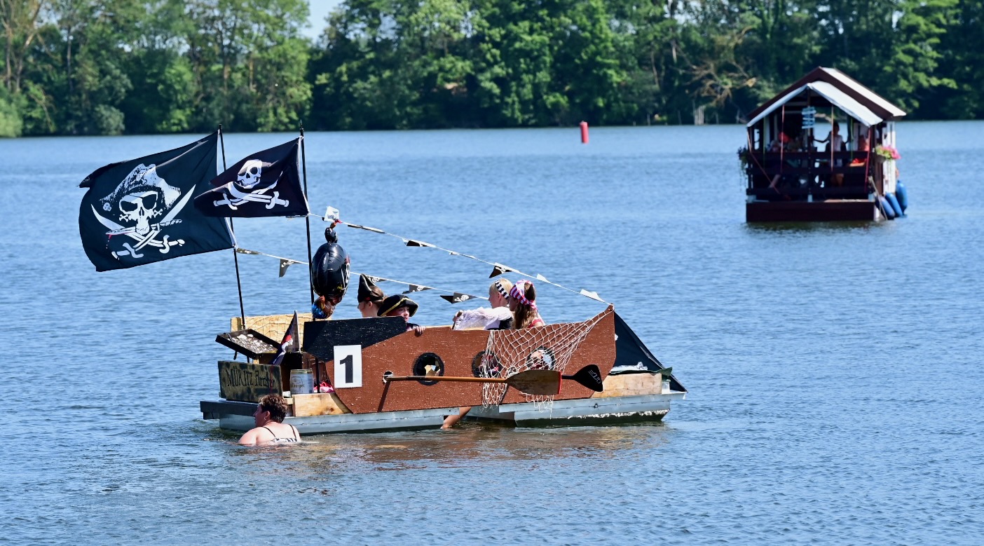 Ganz viel Applaus ernteten die „Müritzpiraten“ aus Ludorf. Sie starteten am Anfang und hatten einen besonderen Motor am Heck – Mama Sarina schwamm die gesamte Strecke mit und schob die liebevoll gestaltete „Badewanne“ mit Schatzkiste und Co. die gesamte Strecke an und schließlich ins Ziel. Dafür gab es einen Sonderpreis – verdient!