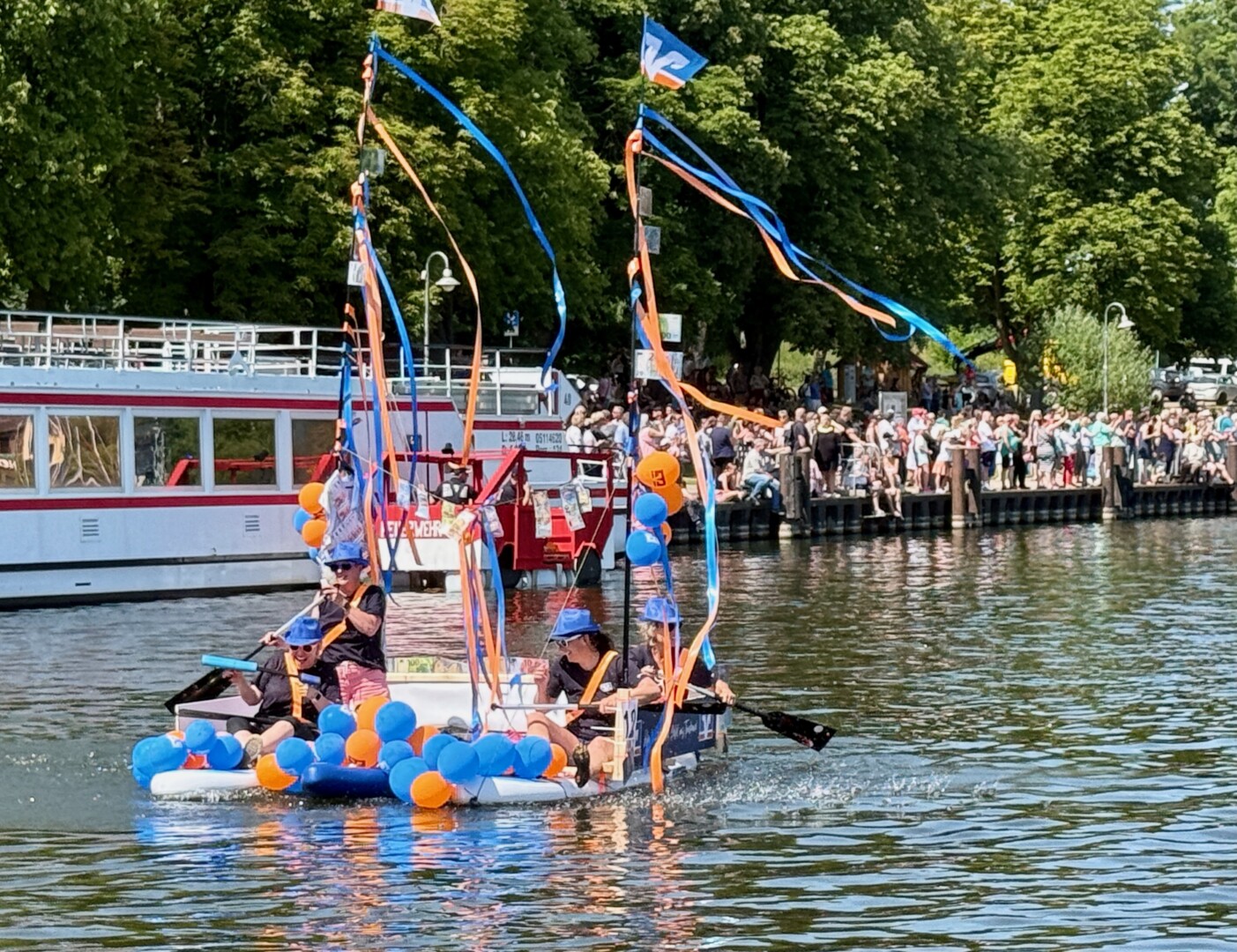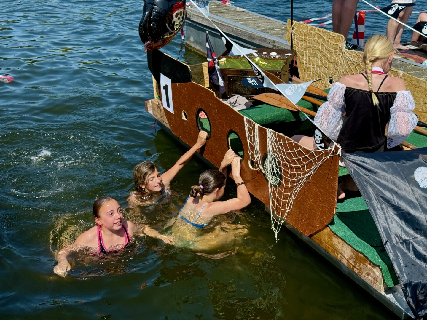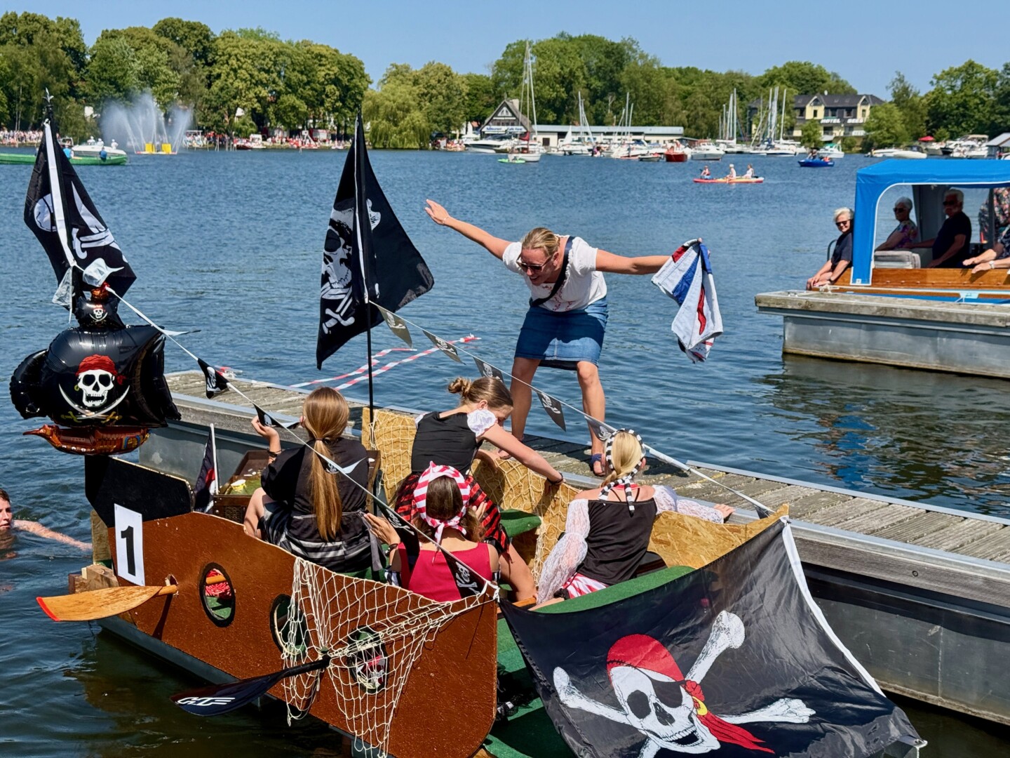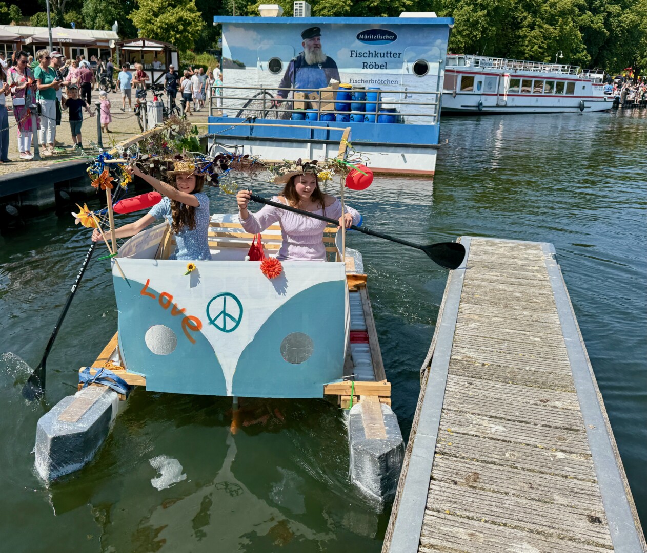 Ganz viel Applaus ernteten die „Müritzpiraten“ aus Ludorf. Sie starteten am Anfang und hatten einen besonderen Motor am Heck – Mama Sarina schwamm die gesamte Strecke mit und schob die liebevoll gestaltete „Badewanne“ mit Schatzkiste und Co. die gesamte Strecke an und schließlich ins Ziel. Dafür gab es einen Sonderpreis – verdient!