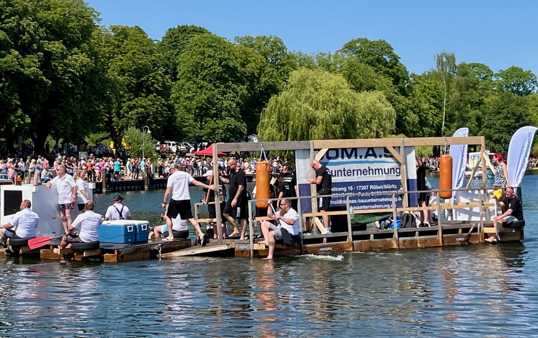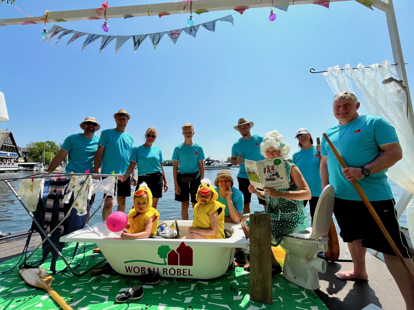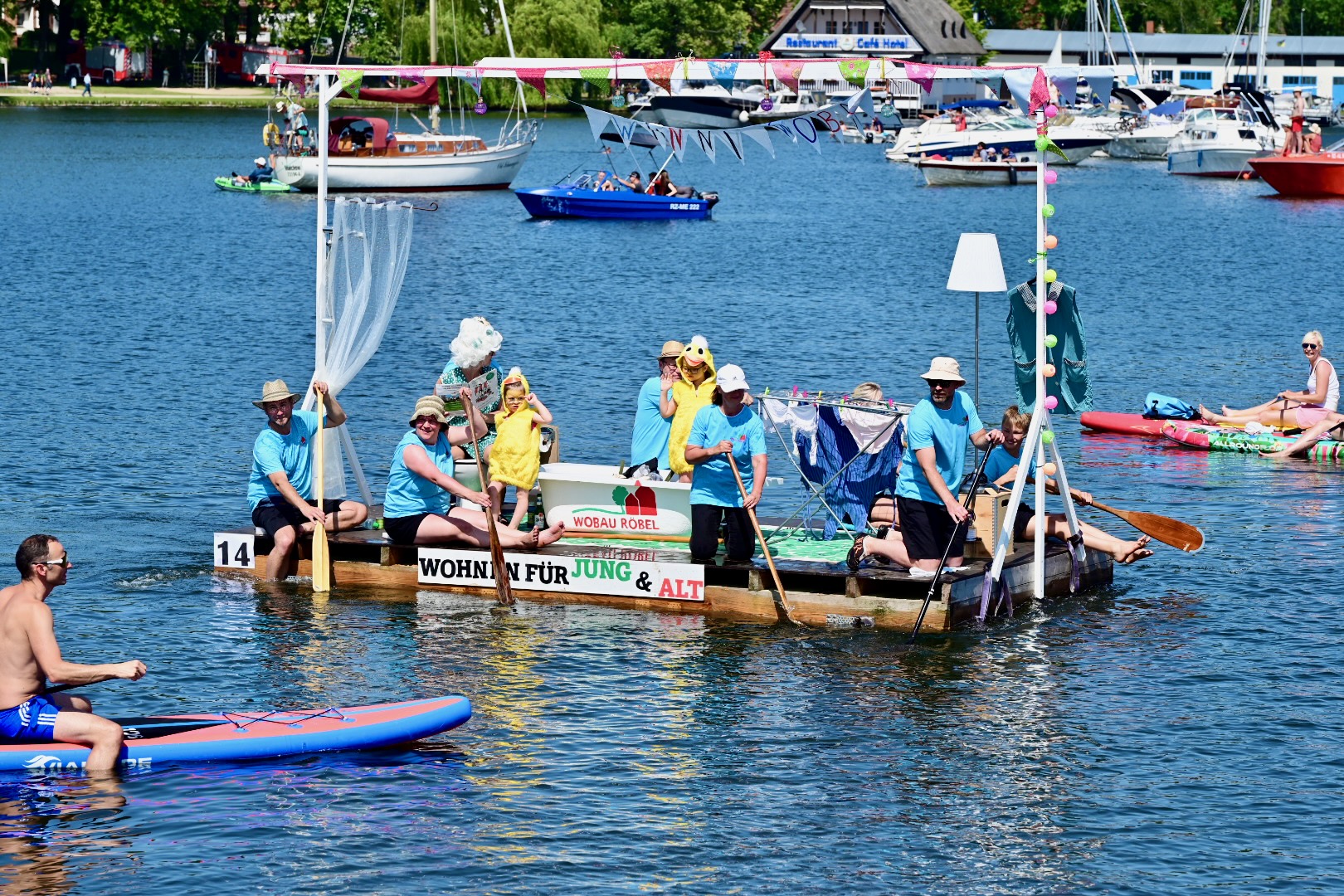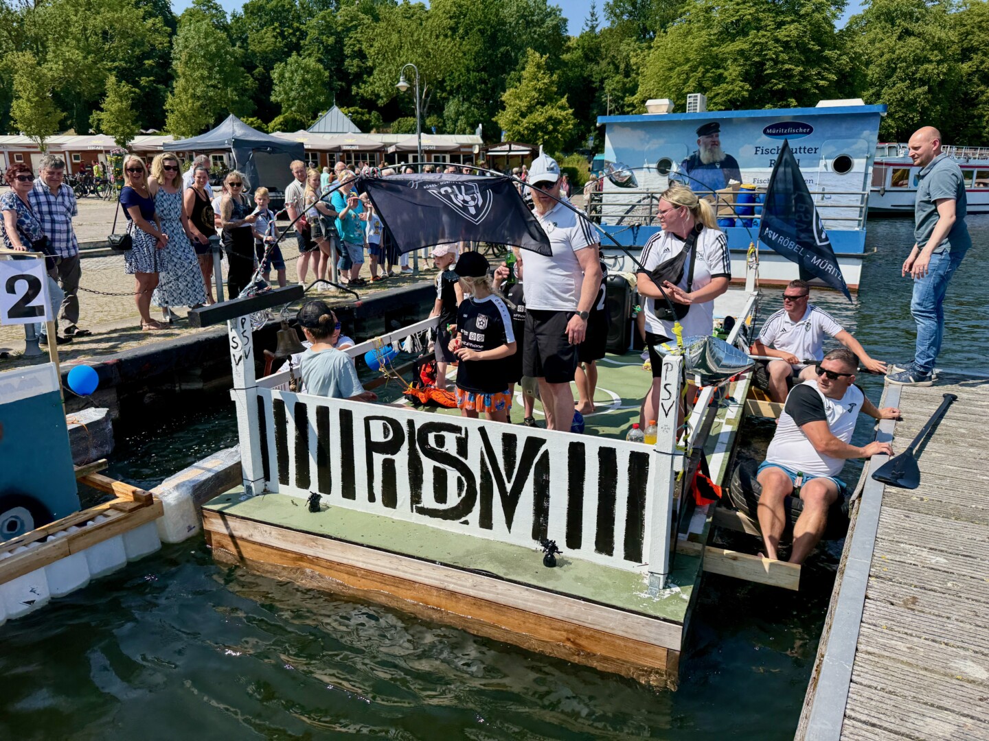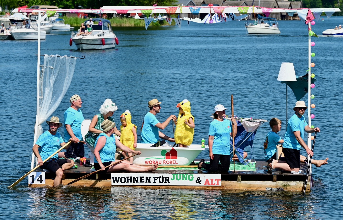 Ganz viel Applaus ernteten die „Müritzpiraten“ aus Ludorf. Sie starteten am Anfang und hatten einen besonderen Motor am Heck – Mama Sarina schwamm die gesamte Strecke mit und schob die liebevoll gestaltete „Badewanne“ mit Schatzkiste und Co. die gesamte Strecke an und schließlich ins Ziel. Dafür gab es einen Sonderpreis – verdient!