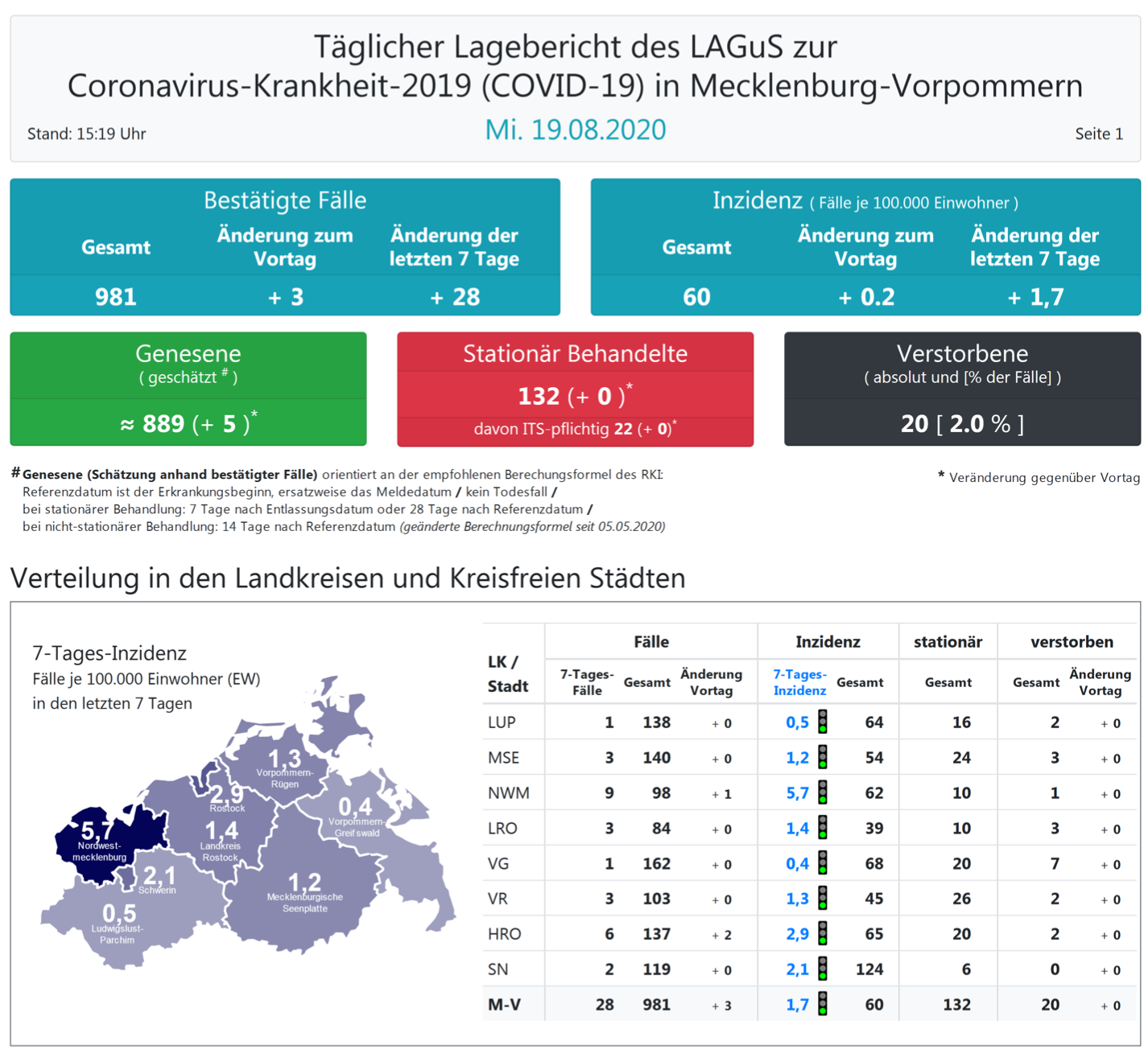 Laut einer Schätzung des Robert Koch-Instituts (RKI) sind in Mecklenburg-Vorpommern 889 (+5) der positiv getesteten Menschen von einer Covid-19-Erkrankung genesen. Insgesamt gab es bislang 20 Todesfälle im Land.