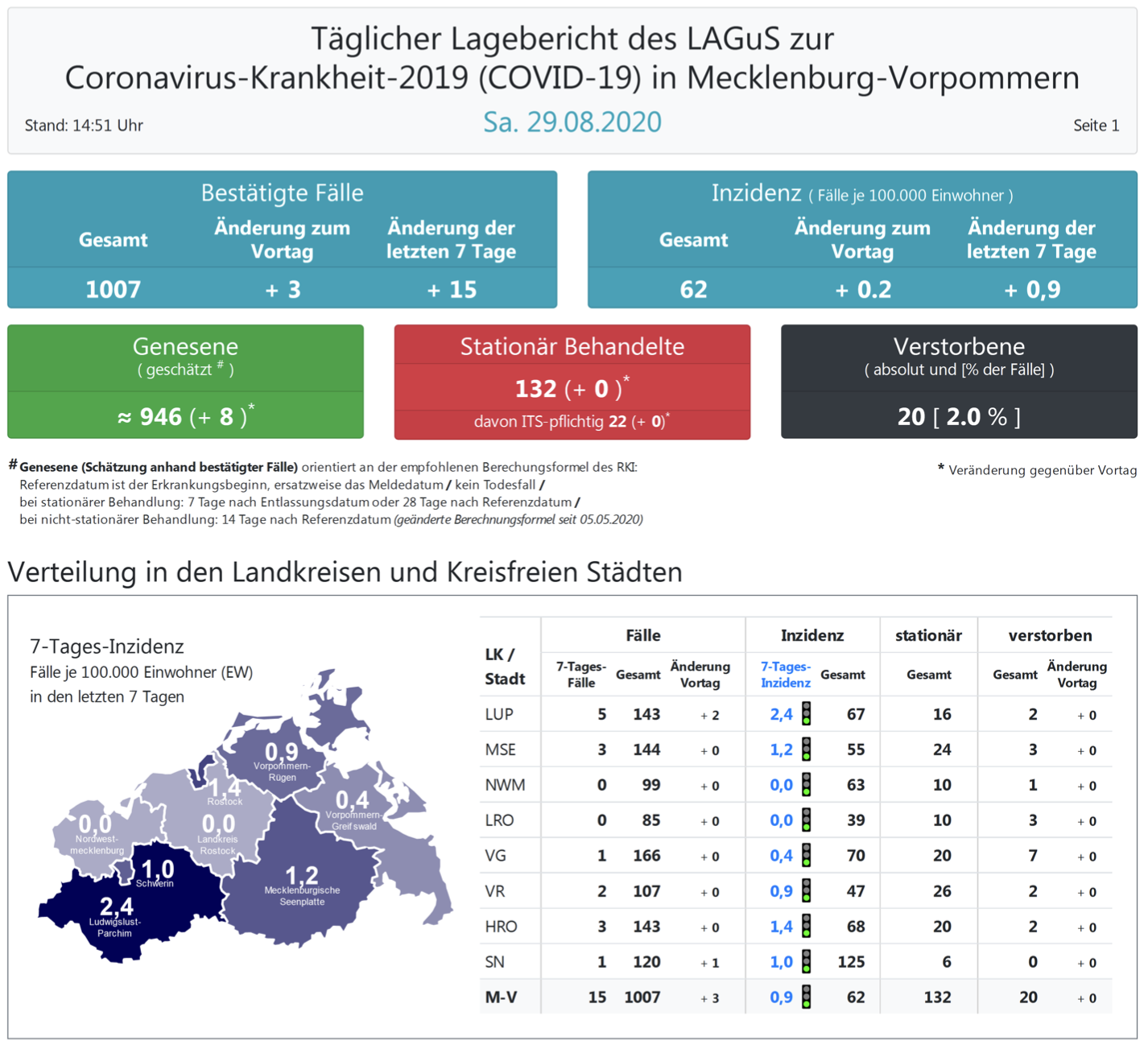 Laut einer Schätzung des Robert Koch-Instituts (RKI) sind in Mecklenburg-Vorpommern 946 (+8) der positiv getesteten Menschen von einer Covid-19-Erkrankung genesen. Insgesamt gab es bislang 20 Todesfälle im Land.