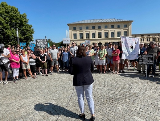 MV-Sozialministerin Stefanie Drese hat heute vor dem Ministerium in Schwerin mehrere Hundert Pflege-Beschäftigte und Pflegedienstbetreiber, die für bessere Bedingungen in der Pflege demonstrierten, empfangen Organisiert wurde die Demonstration durch das Aktionsbündnis „Pflege in Not“, das durch verschiedene private ambulante und Intensivpflegedienste ins Leben gerufen wurde. „Viele ihrer Forderungen wie mehr Aufmerksamkeit und bessere Bedingungen für die Pflege sowie mehr Solidarität mit den Beschäftigten, den Pflegebedürftigen und den pflegenden Angehörigen teile ich“, betonte die Ministerin, die selbst zum Mikrofon griff, um mit den Demonstrierenden ins Gespräch zu kommen.