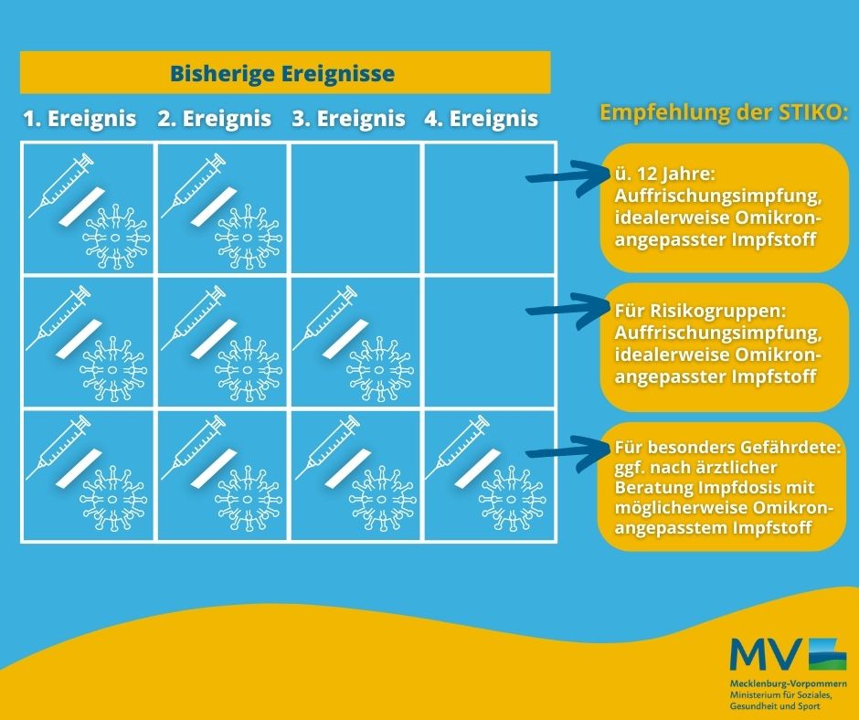 Mit Verweis auf den jüngsten Beschluss der Ständigen Impfkommission (STIKO) empfiehlt MV-Gesundheitsministerin Stefanie Drese allen Personen ab 12 Jahren eine COVID-19- Auffrischimpfung (3. Impfung) vorzugsweise mit einem Omikron-adaptierten bivalenten mRNA-Impfstoff. Die Booster-Impfung sollte im Regelfall 6 Monate nach abgeschlossener Grundimmunisierung (2. Impfung) oder durchgemachter Infektion erfolgen. „Primäres Ziel der Corona-Impfung ist weiterhin die Verhinderung schwerer COVID-19-Verläufe“, betonte Drese. Die Ministerin verwies zudem darauf, dass durch das neue Infektionsschutzgesetz des Bundes auch rechtlich eine Änderung bei der Definition eines vollständigen Impfschutzes vollzogen werde. Danach liegt ab dem 1. Oktober 2022 ein vollständiger Impfschutz nur vor: