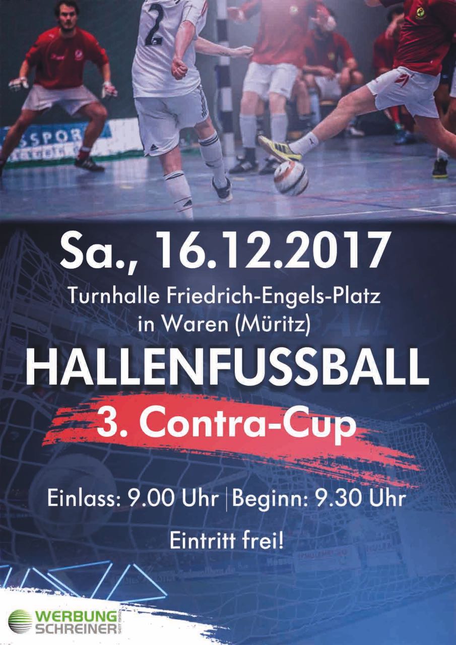 Auch in diesem Jahr wird der CONTRA-Hallencup wieder in Waren ausgetragen. Zum bereits dritten Mal. Das Turnier startet am kommenden Sonnabend, 16. Dezember, um 9:30 Uhr. Doch dieses Mal werden die spannenden Spiele nicht in der Turnhalle der Berufsschule angepfiffen, sondern in der Turnhalle am Engelsplatz.